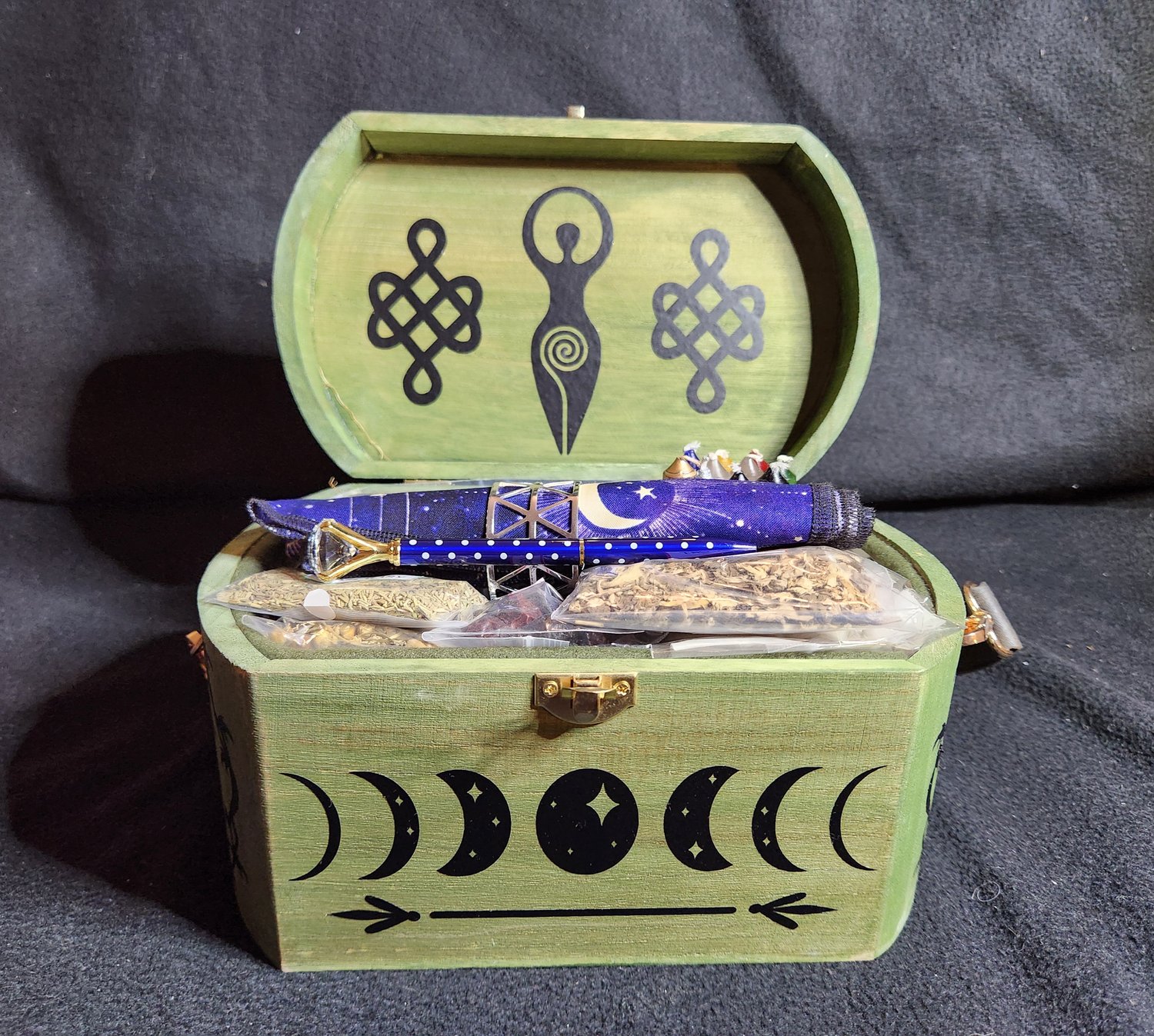 These well-crafted boxes can be left open or stored closed on a table or shelf (for anyone who is discreetly practicing their magick). Box is so beautifully designed that it is sure to be admired wherever it is placed!