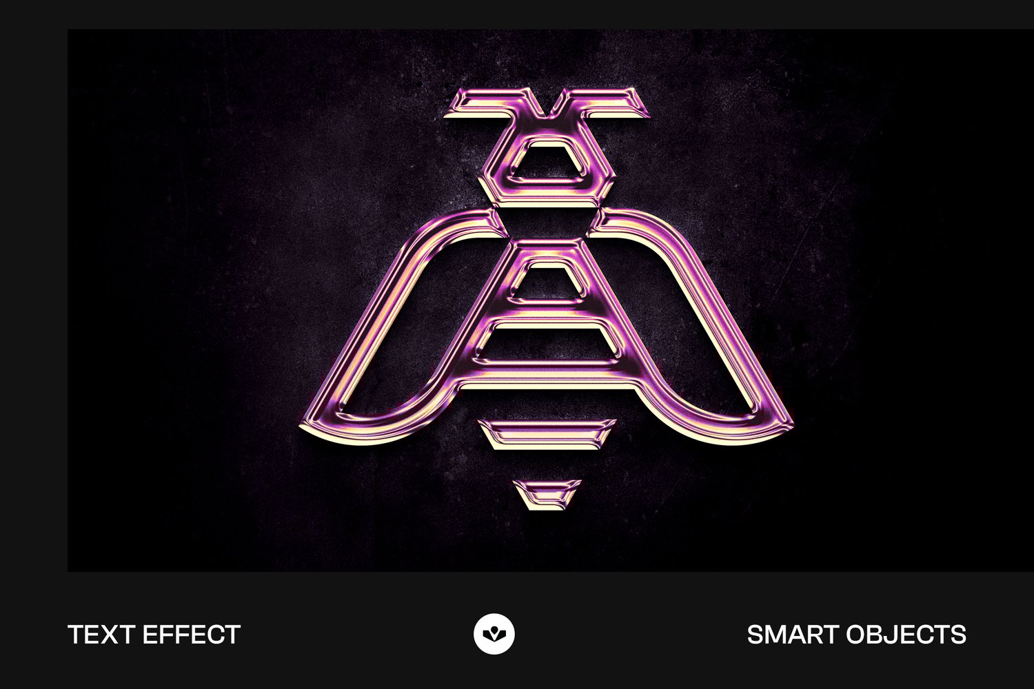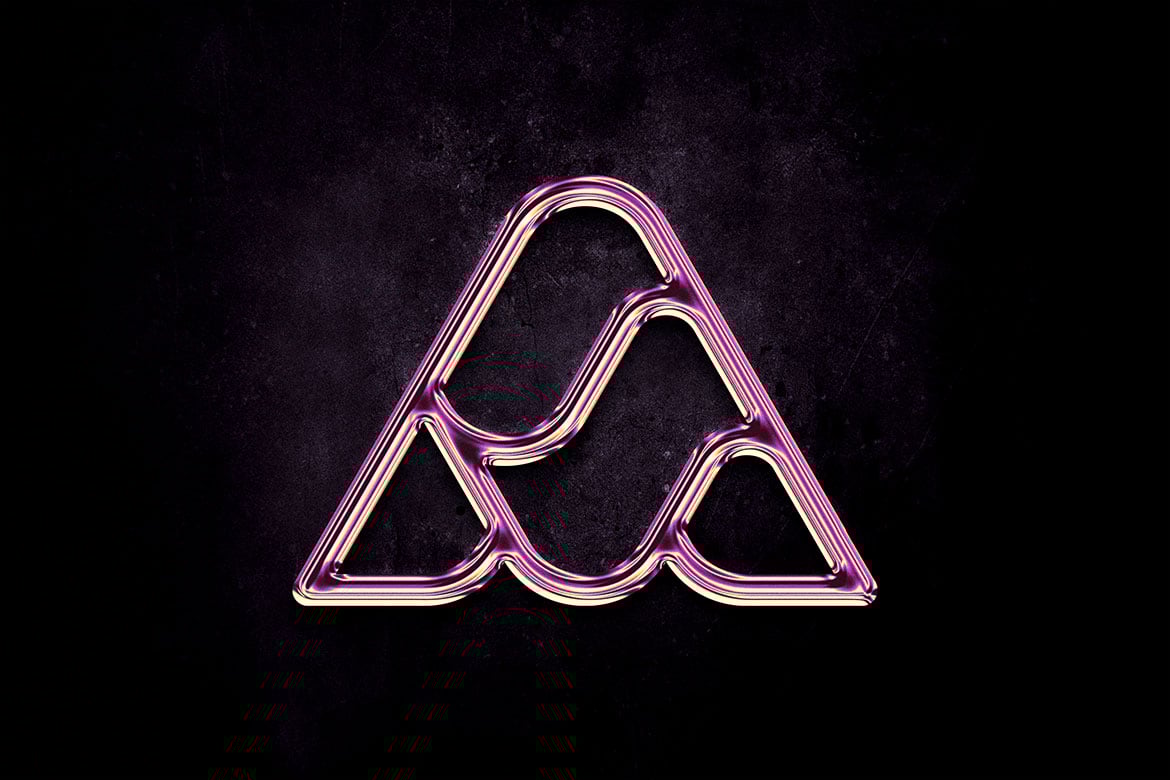 Features a metallic, neon-inspired emblem with a glossy, chrome-like finish. The lines forming the symbol have a smooth, tubular appearance, blending vibrant pink and soft golden hues that create a luminous glow.
