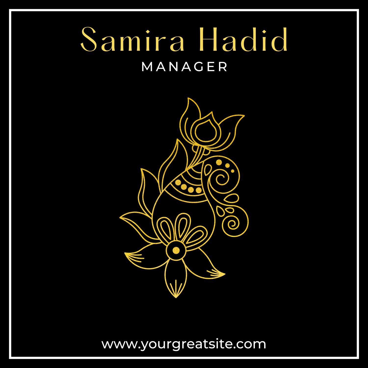 Black and gold and white Floral design square Business Card Simple, Elegant, Gold Business Card. ✨💼 This black luxury business card has a gold logo with stylish font business details