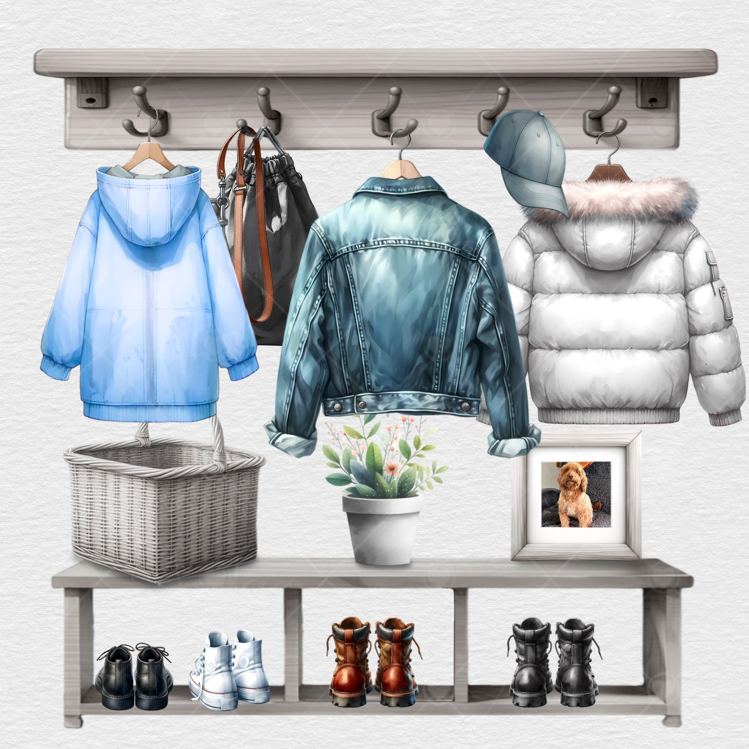 Family Hallway clipart collection. 50 clipart items; coats, shoes, furniture etc. 50 PNG files. Sublimation, print, DTF etc.