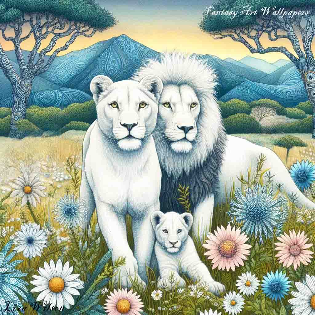 White lions and cub with flowers, trees and mountains. The sun is setting in the background.