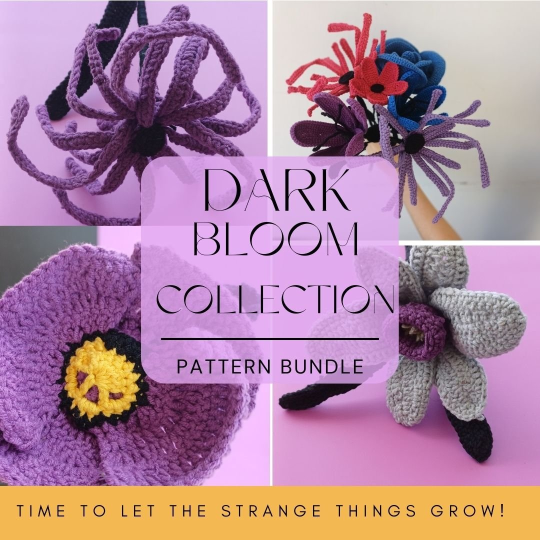 The Dark Bloom Collection is a curated bundle of 10 original crochet patterns inspired by gothic romance, night gardens, and flowers that refuse to be sweet. Think dramatic petals, moody textures, and designs made to stand out not blend in.