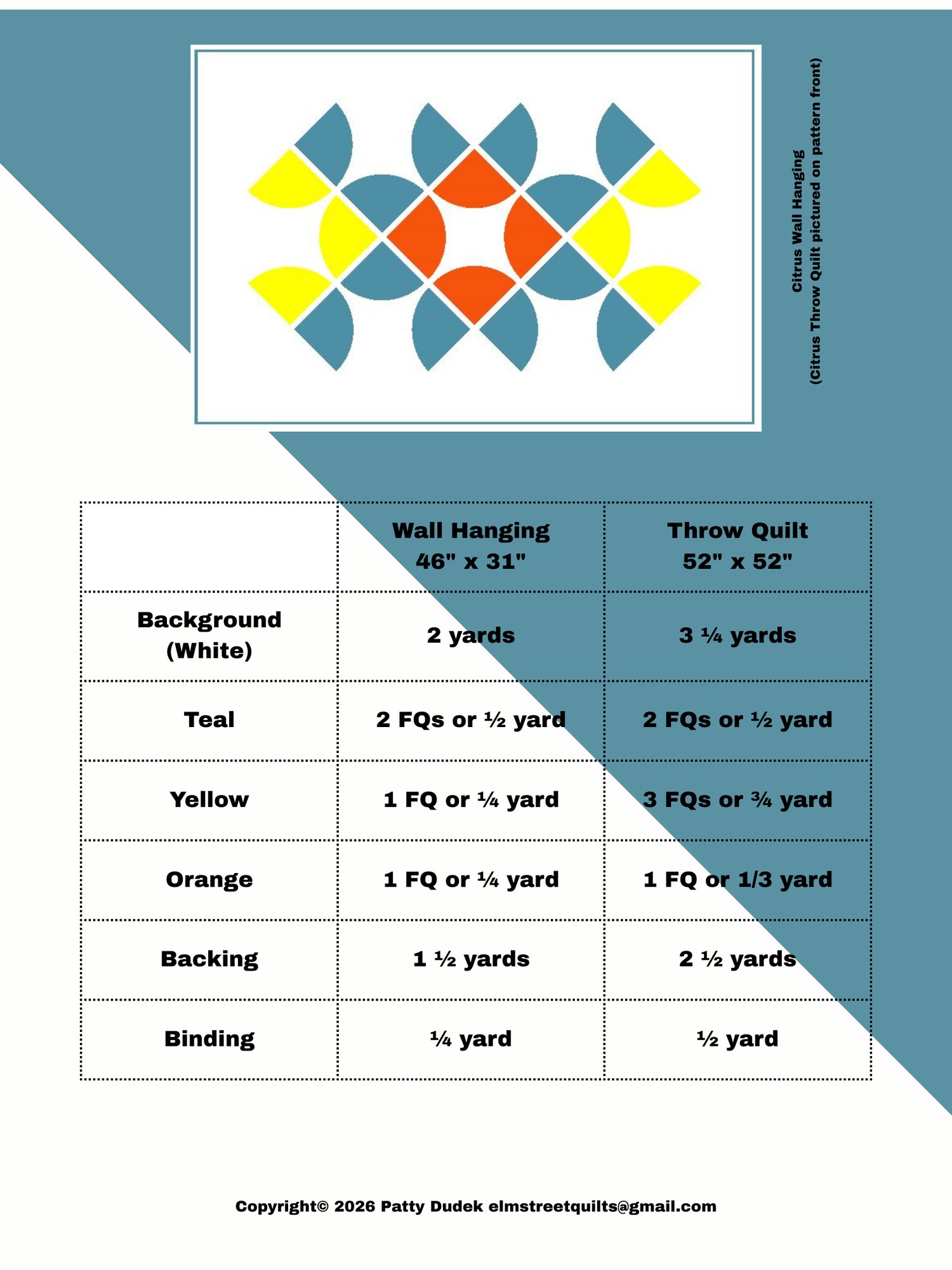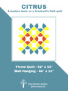 The pattern includes instructions to make a wall hanging (46" x 31") or a throw sized quilt (52" x 52"). The pattern is FQ friendly and a wonderful way to feature key fabric or bright colors.