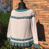 Reaching Out is a relaxed fit top-down sweater designed with about 10cm of positive ease. It is worked in the round with a yoke construction that merges into raglan shaping after the yoke patterning. Stocking stitch highlights the slip-stitch pattern on the yoke, border and cuffs, and the sweater is finished with a ribbed neckband.