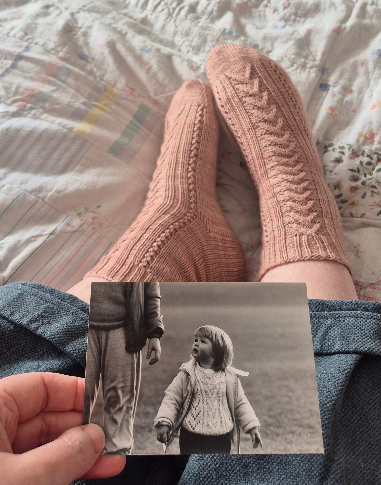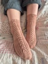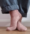 The Lovelight socks begin at the cuff with a tidy rib that flows neatly into a cosy textured sock of simple but eye catching stitches. The pattern contains three sizes, small, medium, and large and is worked top down with a slip stitch heel and a flap and gusset construction. They end with a rounded toe. This timeless design would look beautiful in almost any yarn, a tonal or lightly speckled yarn will really show off the pattern.