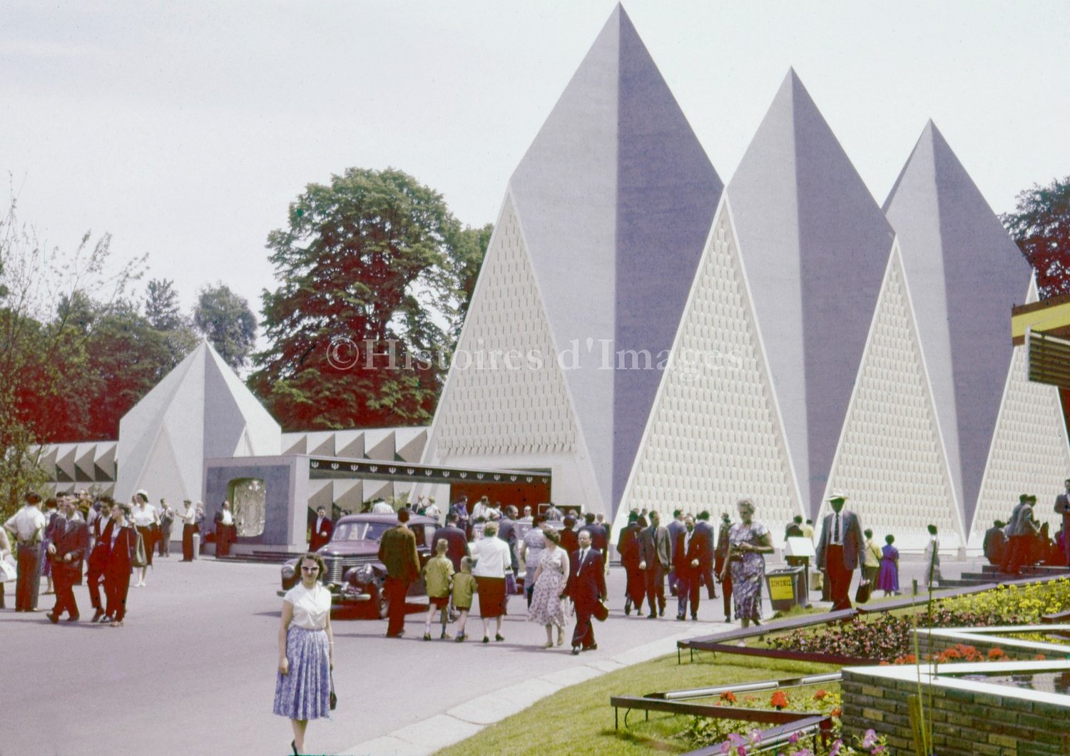 Step back into the iconic World’s Fair of 1958 with this rare color photograph of the British Pavilion at Expo 58 in Brussels. Featuring striking geometric architecture and the timeless elegance of mid-century visitors, this image captures the spirit of postwar modernism.