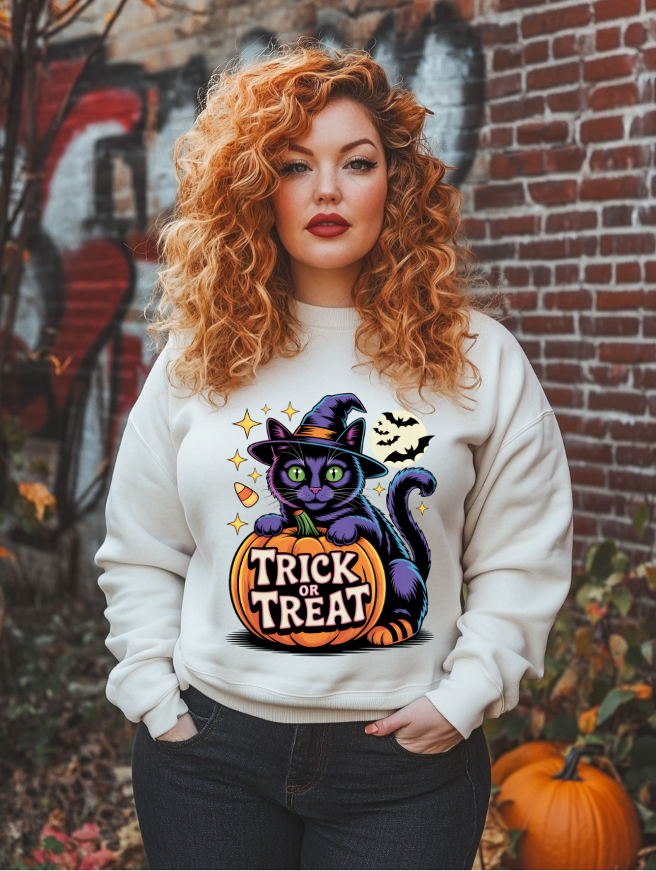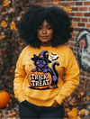 Add some magical mischief to your Halloween projects with this Trick or Treat Black Cat digital design! Featuring a playful black cat with green eyes wearing a witch hat, sitting atop a pumpkin with “Trick or Treat” lettering, this design is purr-fect for spooky season crafts.