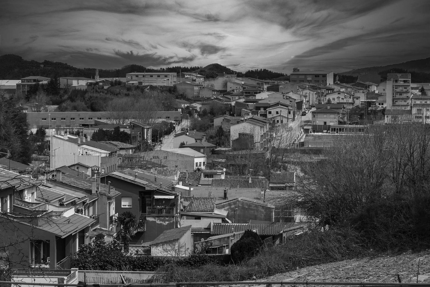 An aerial view of Caldes de Montbui from above the town. Black and white helps a lot in this type of landscape.