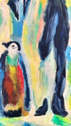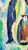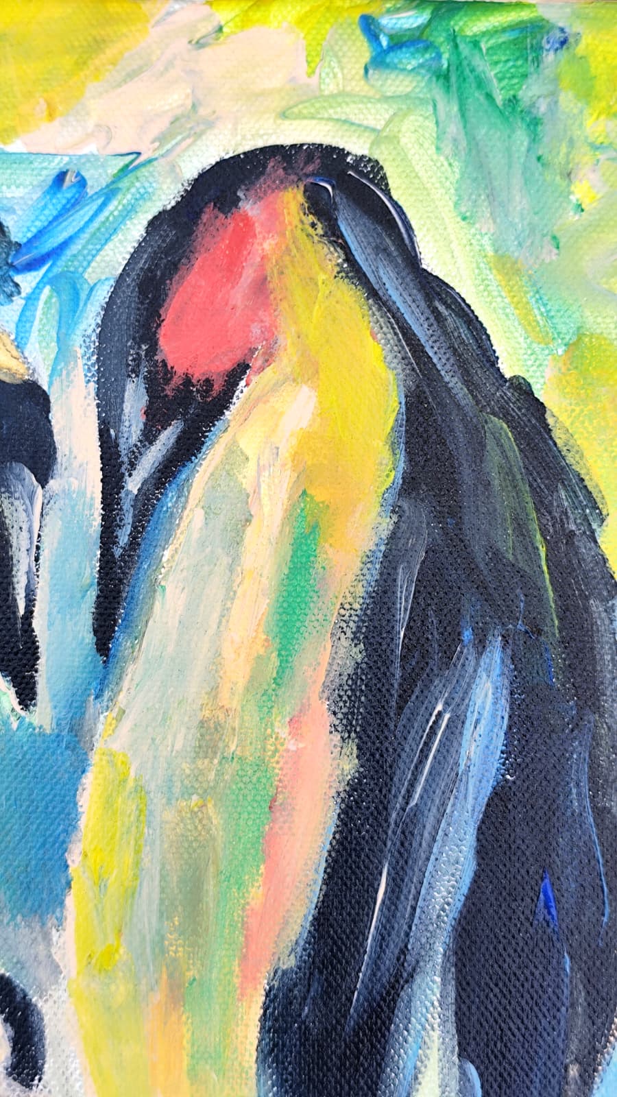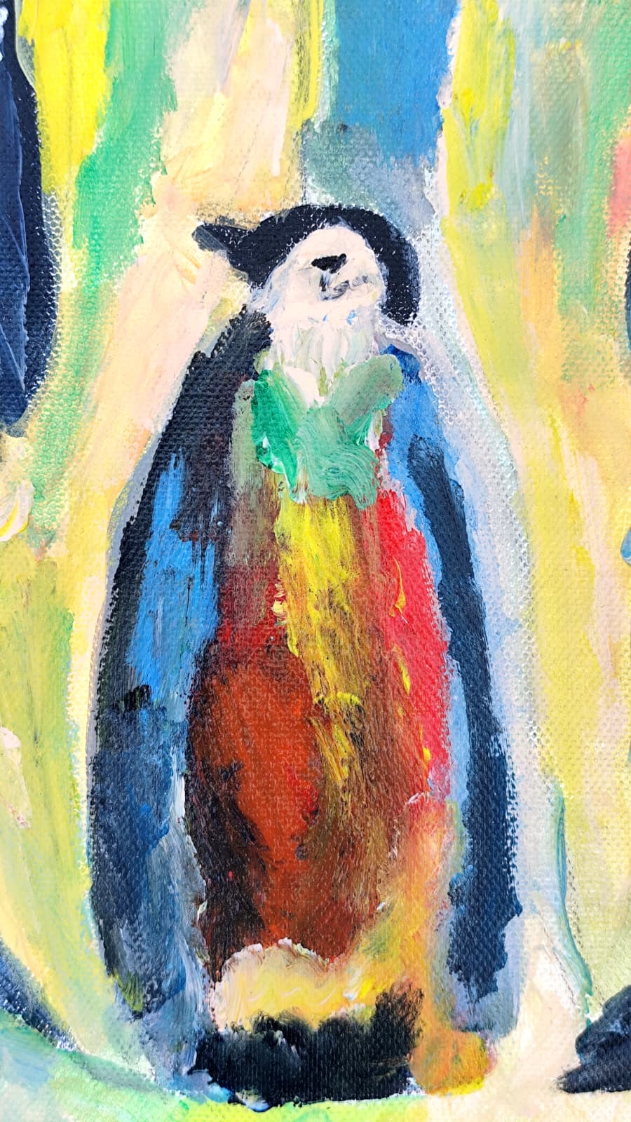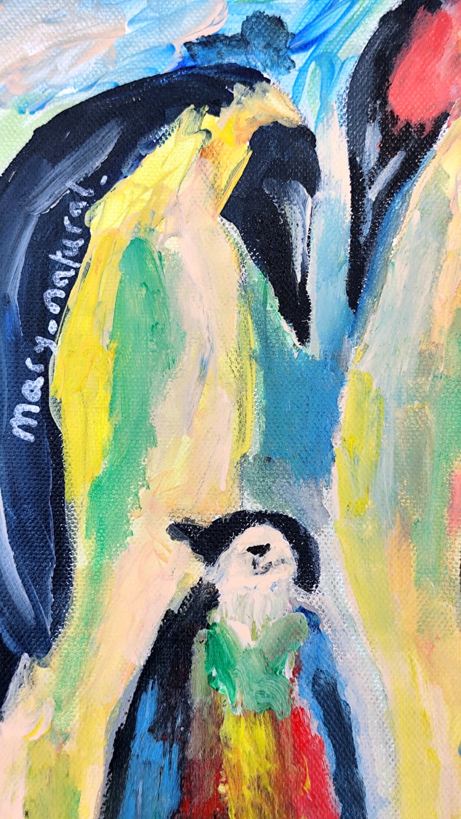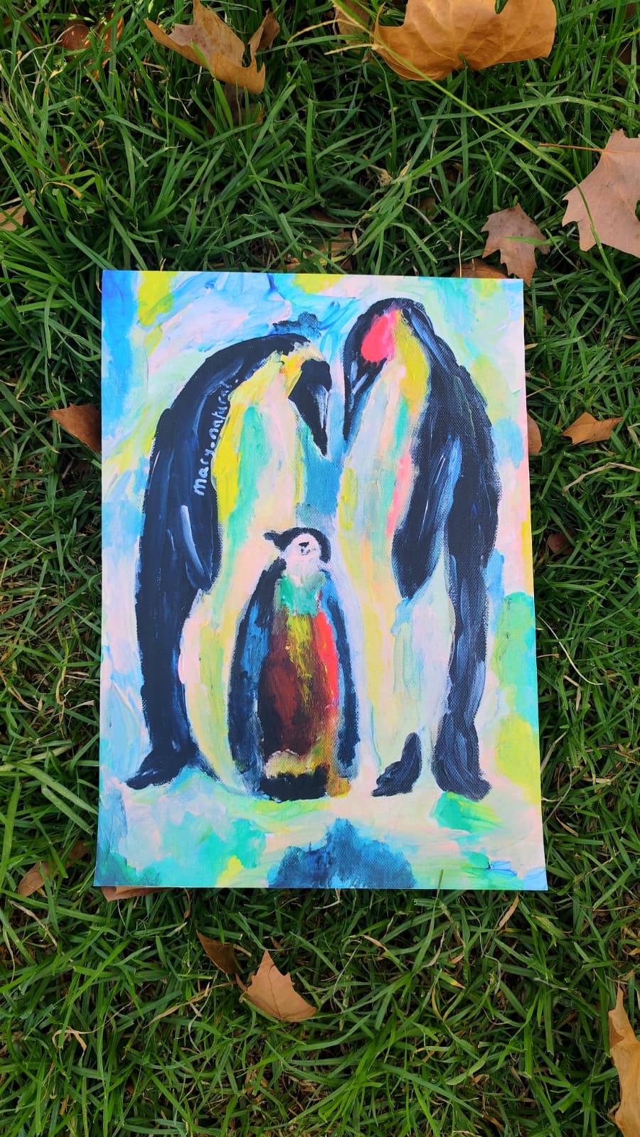 Lámina basada en el lienzo realizado en una tarde de inspiración espontánea, donde decidí plasmar tres pingüinos sin preocuparme por el realismo exacto ni por medir cada detalle al milímetro. Mi intención no era representar los colores reales de los pingüinos, sino capturar su esencia a través de mi propio estilo en aquel momento concreto que me pedía expresarlo así.