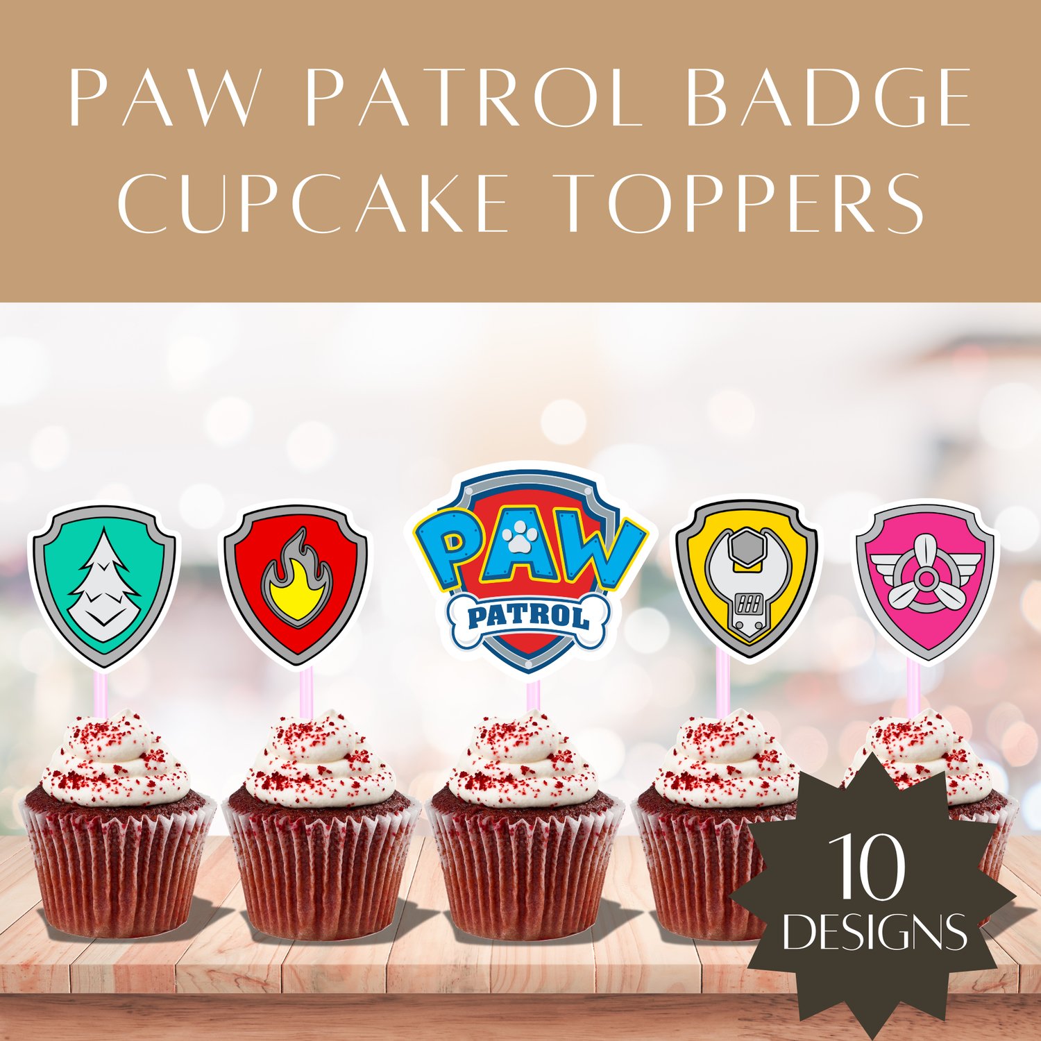 - High-resolution JPG file with multiple Paw Patrol pup badge cupcake toppers