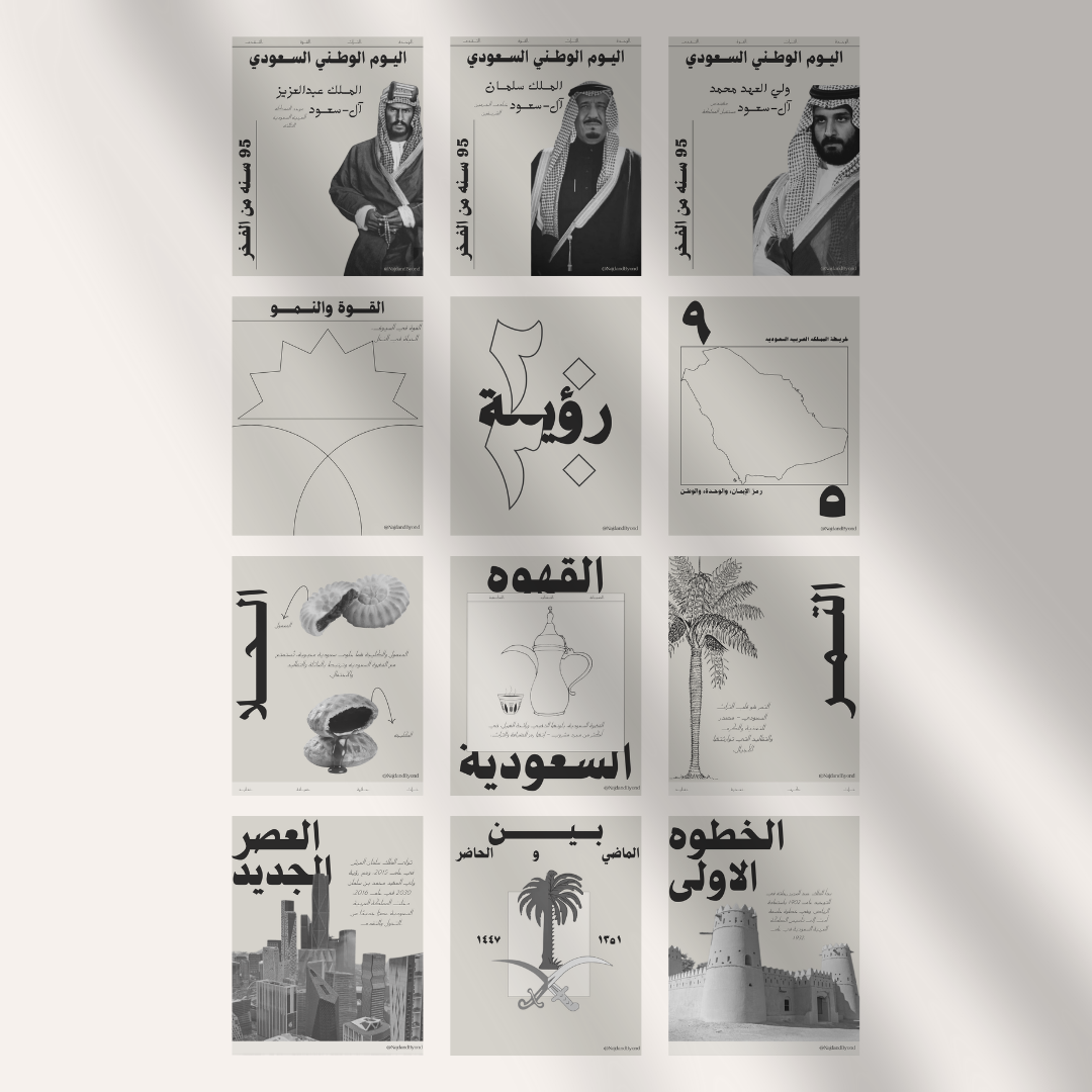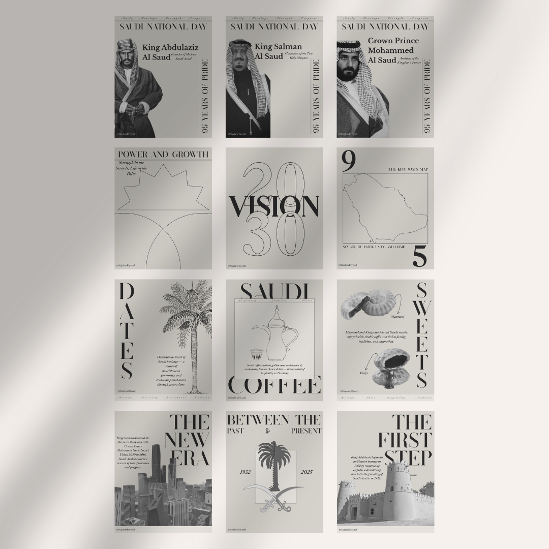Celebrate Saudi National Day with elegance and pride using this set of 12 customizable Instagram templates. Designed in a modern yet heritage-inspired style, these templates highlight Saudi culture, Vision 2030, coffee traditions, sweets, and iconic landmarks. Perfect for brands, content creators, and individuals who want to share national pride with a professional aesthetic.