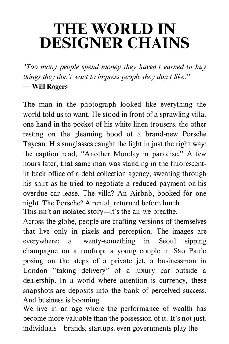 This book was born out of war. A war against appearances. A war against the toxic culture that convinces ordinary people to burn their last paycheck just to pose as extraordinary. A war against a world where perception sells more than reality.