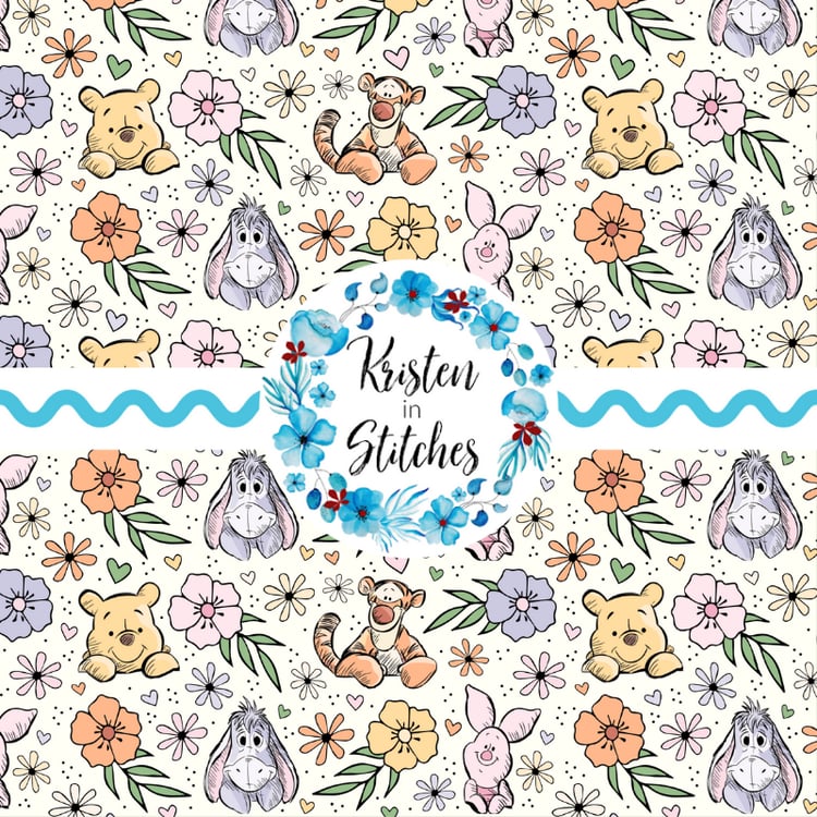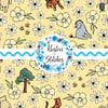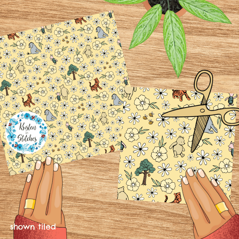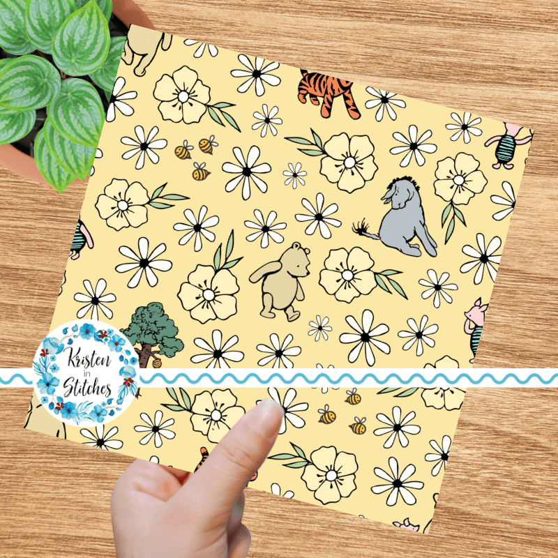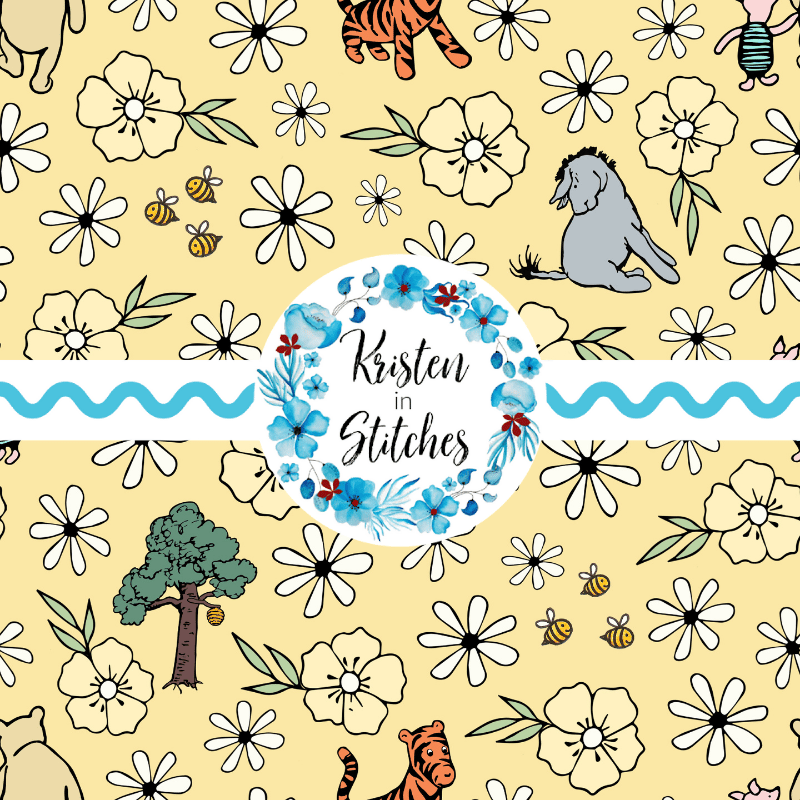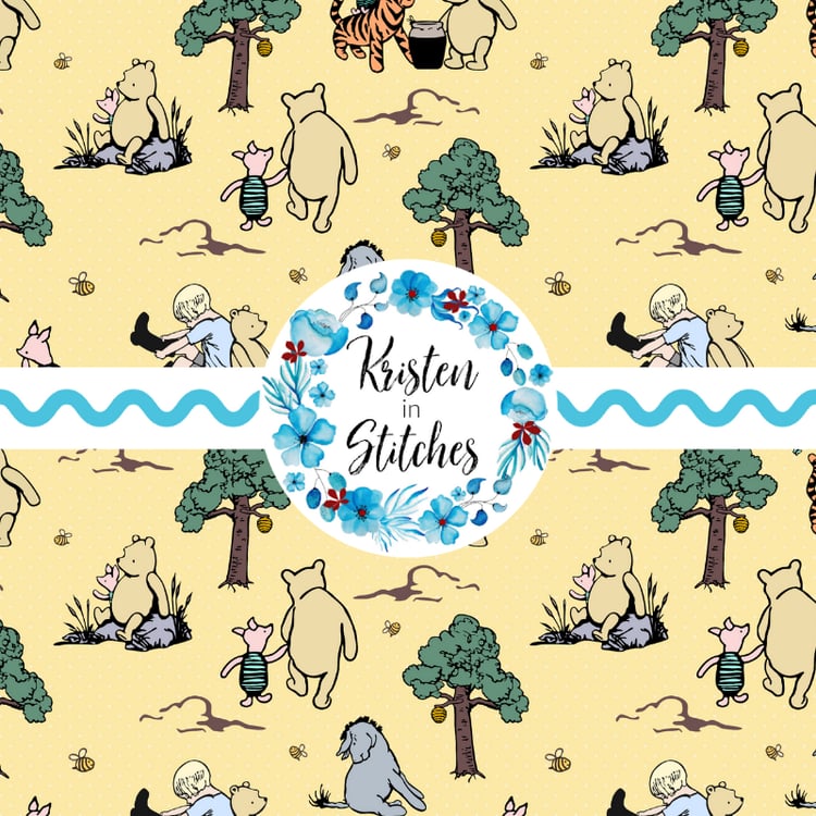 Classic Pooh storybook sketches from the 100 Acre Wood, including Eeyore, Tigger and Piglet on soft pale yellow.