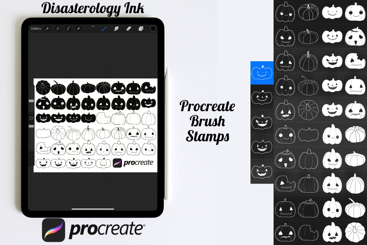 Pack of Halloween spooky pumpkin Procreate Stamp Brushes! These 45 pumpkin stamps are perfect for making illustration projects or any procreate purpose. You can use these in any colour or opacity and they can be resized to best fit your art. You need Procreate 5.0.8 or 5X, an iPad, and an Apple Pencil. Also, these stamp brushes are not pressure sensitive and can be used with third party stylus, Apple Pencil or even your finger. You can change the colour, size and opacity of these stamps.