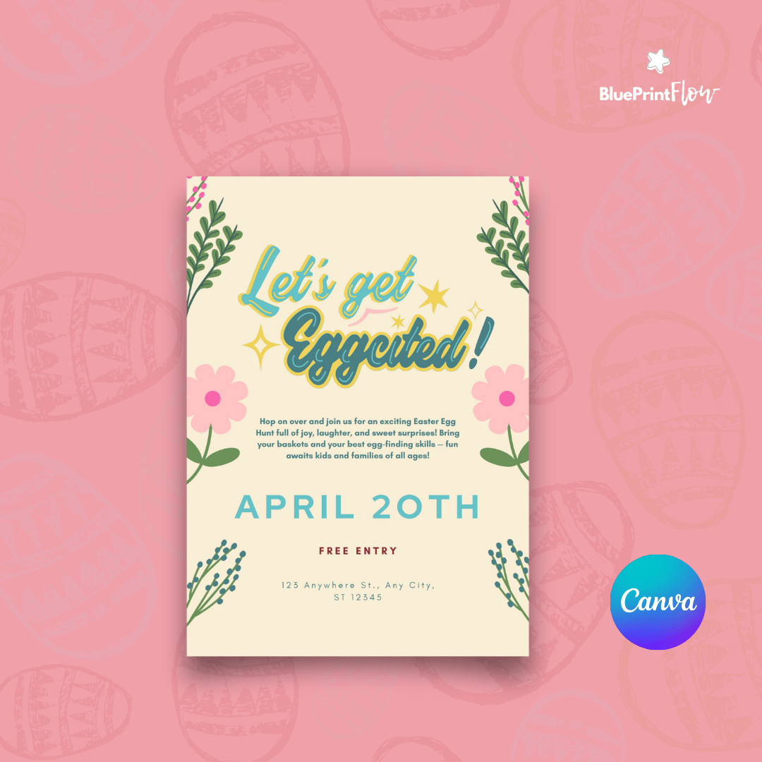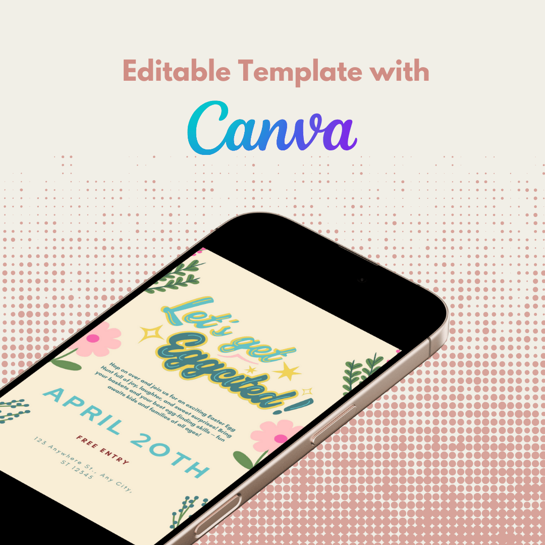 [FREE] Let's get Eggcuted April Egg Hunt Easter Spring Invitation Card Canva Template Design