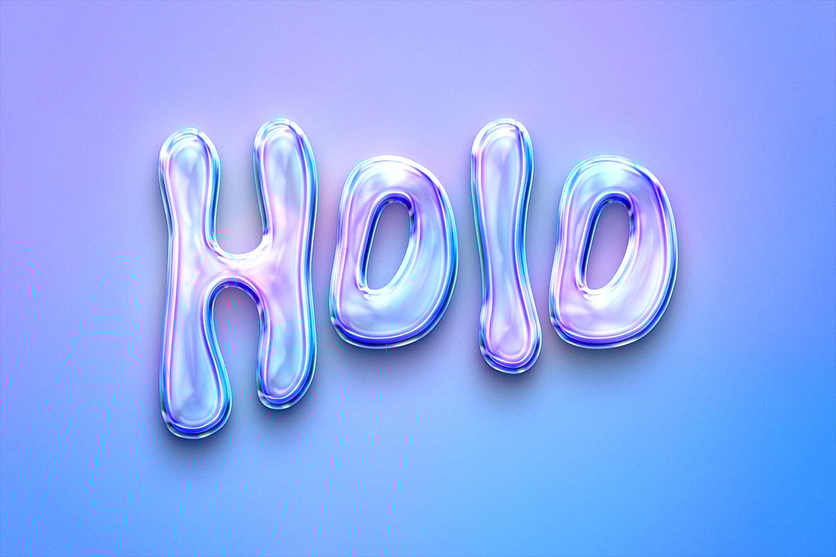 The colors are iridescent, blending pastel tones of purple, blue, and pink, which give the text a shiny, almost translucent look, like bubbles or soap film.