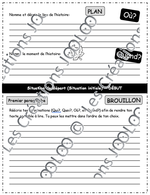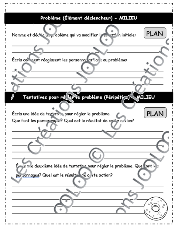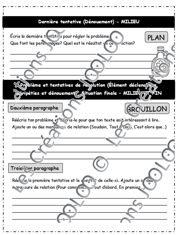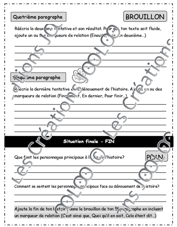 - 3 feuilles de plan pour l'événement déclencheur, les péripéties et le dénouement ainsi que la situation finale.