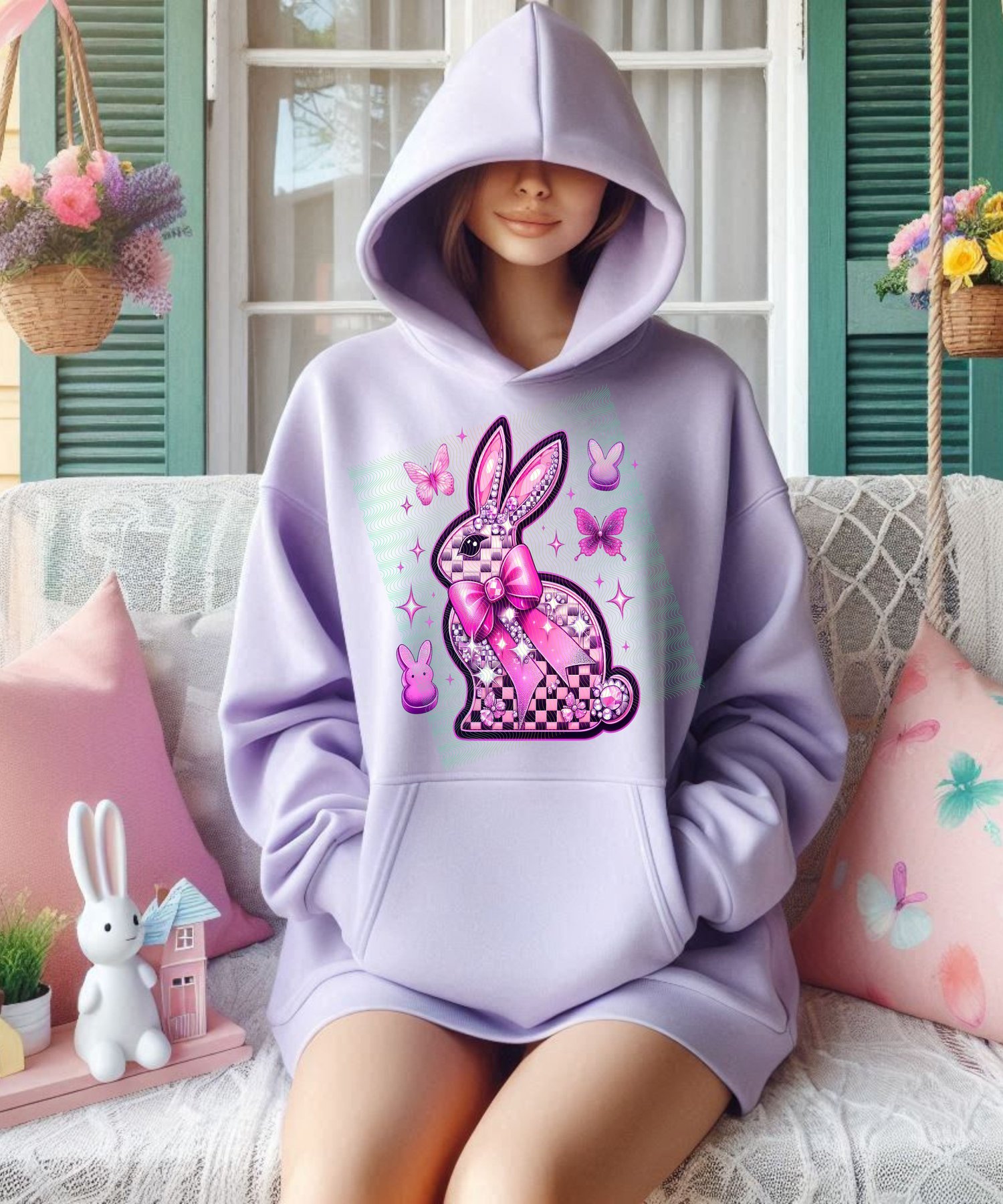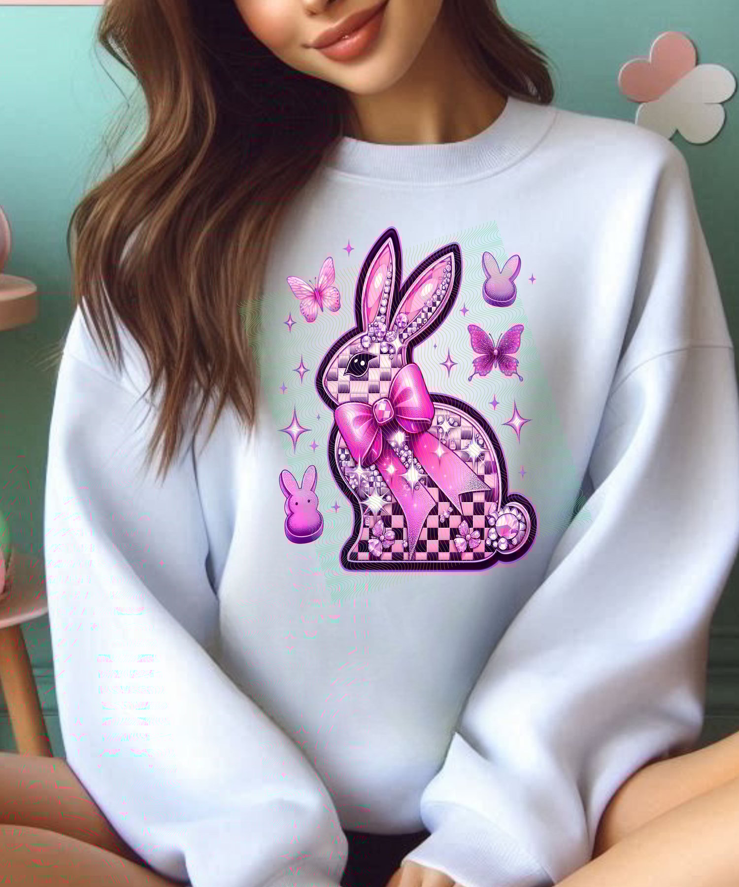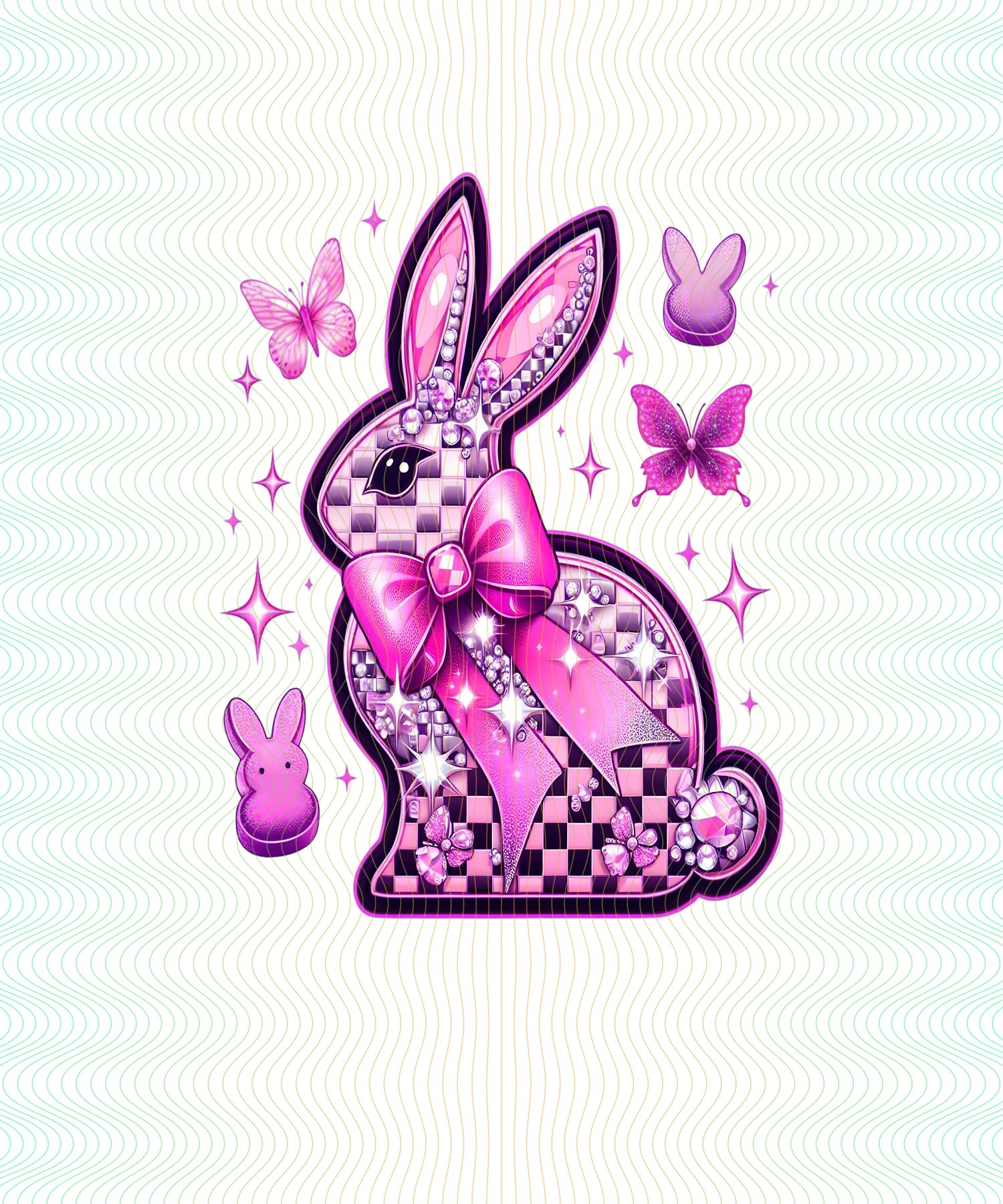 💎🐇 A dazzling bunny with a checkered pattern, pink bow, and sparkling effects! Surrounded by butterflies, this chic design is perfect for adding glam to your Easter collection.
