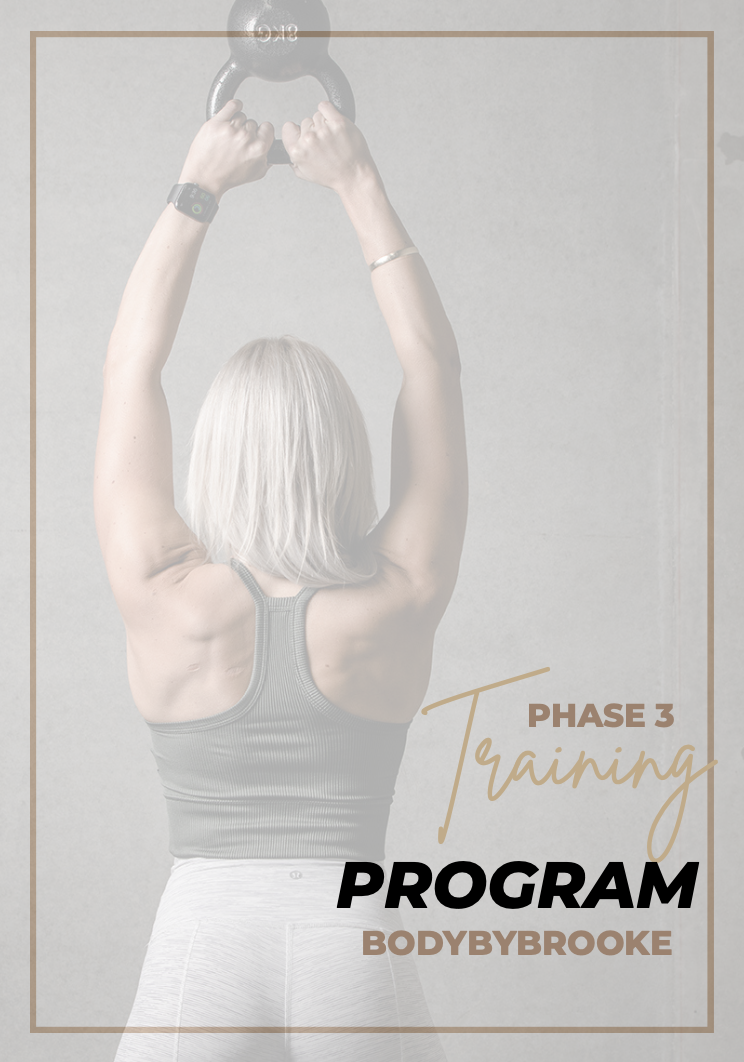The PHASE 3 training plan includes a 4 day gym training program, consisting of 2 x upper body days and 2 x lower body days. There is also core training included on upper body days.