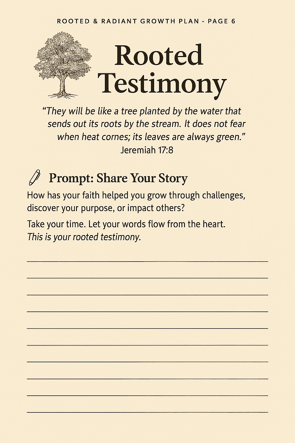 - Page 6: Rooted Testimony – Long-form journaling prompt to share your story
