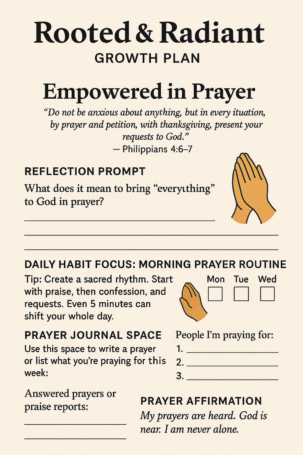 The Rooted & Radiant Growth Plan is a beautifully designed 6-page printable workbook created to guide women and teen girls through a transformative spiritual journey. Each page blends scripture, reflection prompts, habit tracking, and journaling space to help you grow deeper in your walk with God.