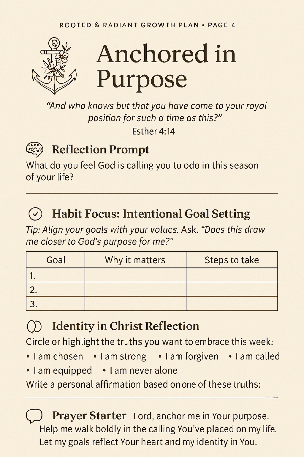 - Page 4: Anchored in Purpose – Goal setting + identity in Christ reflection