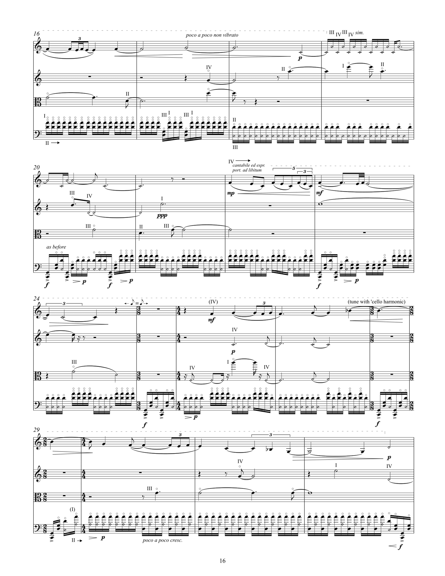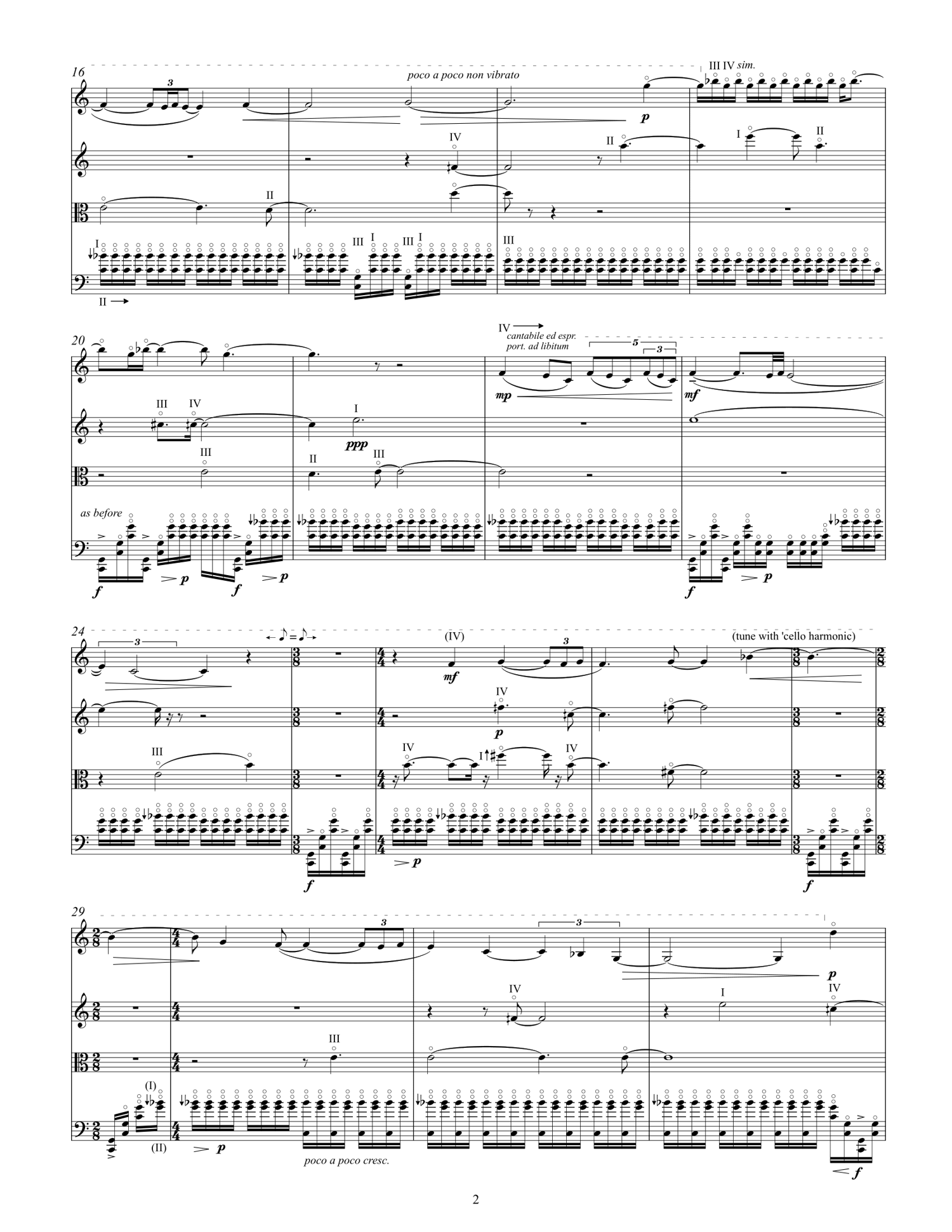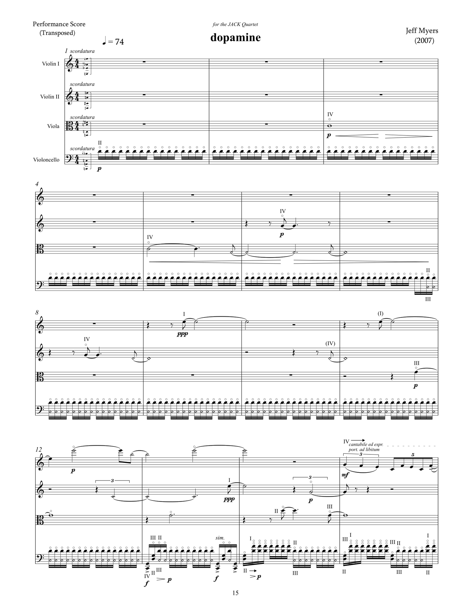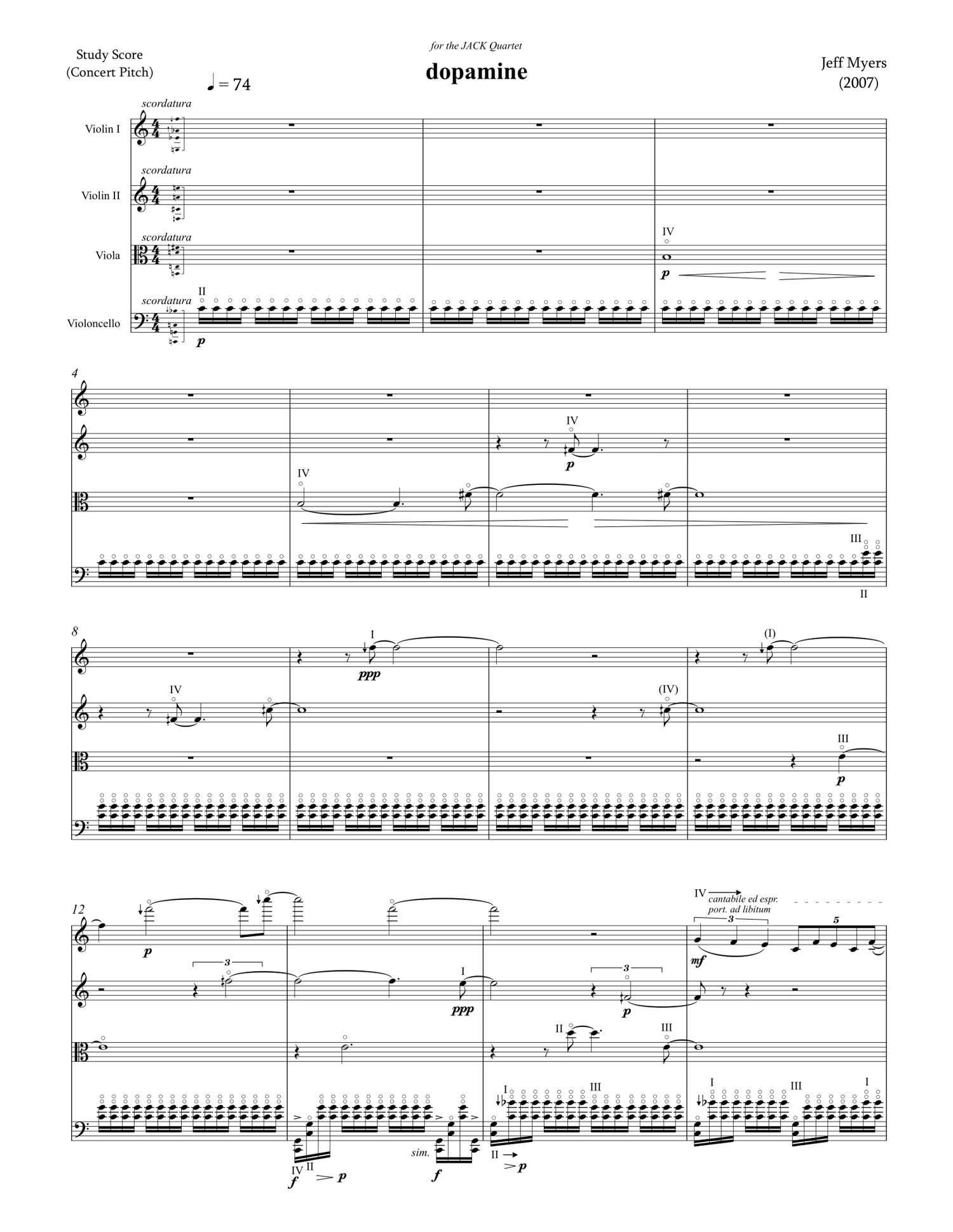 dopamine was written for the JACK Quartet. It uses scordatura (retuning) and natural harmonics on the all the instruments to obtain precise microtonal notes and chords. The title refers to a hormone and neurotransmitter which occurs in humans and some mammals. Dopamine is typically associated with the pleasure system; people with higher dopamine levels tend to seek out more pleasurable activities and vice versa. Dopamine is also associated with creativity and the generation of new ideas. I used dopamine as a metaphor for this string quartet because it was written within a short span of a few days in an unprecedented creative fervor. My motivation came from both the creative experience and from the music itself, which gave me great pleasure to listen to. Perhaps my own level of dopamine was very high as I wrote this music. I suppose I will never know.