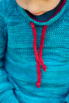 THINGAMAJIGGER is a seamless unisex pullover knit from the top down, with textured faux striping, pockets and tied turtle neck. The whole sweater is worked in one color with a couple details in contrasting yarn.