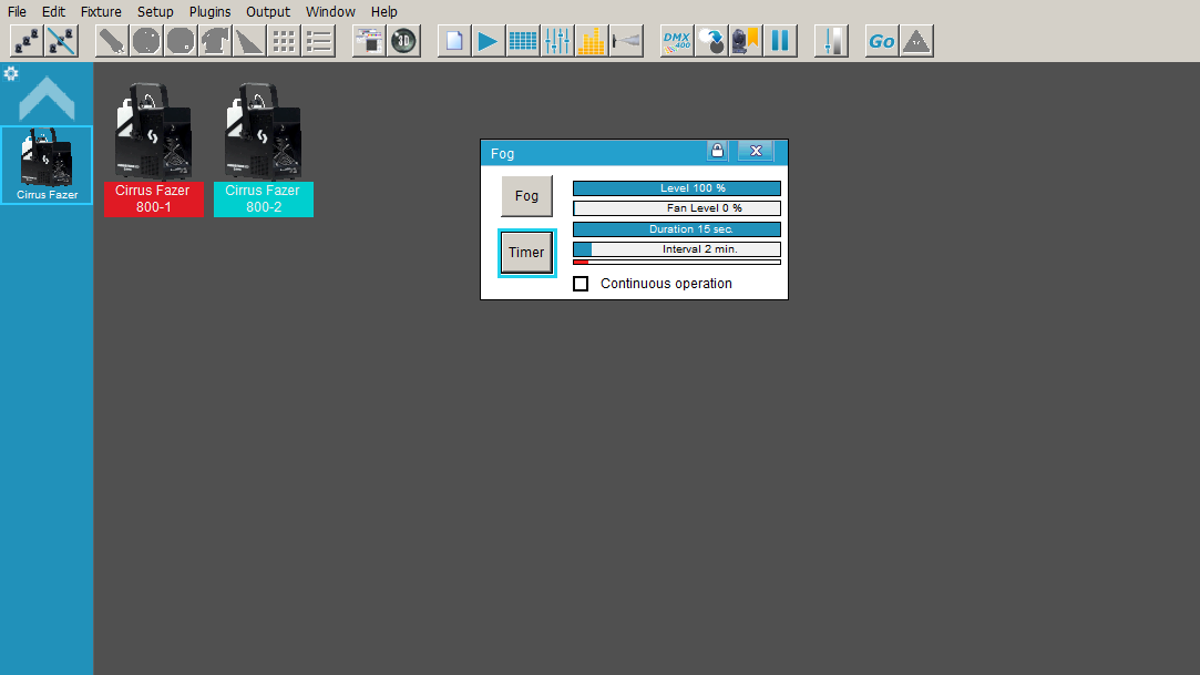 Con el Botón de “Fog” disparan niebla mientras que esté presionado el botón. Al soltar apaga. Si activan el box de “Continuos Operation” queda apretado el botón por lo que largará niebla hasta que lo vuelvan a presionar.