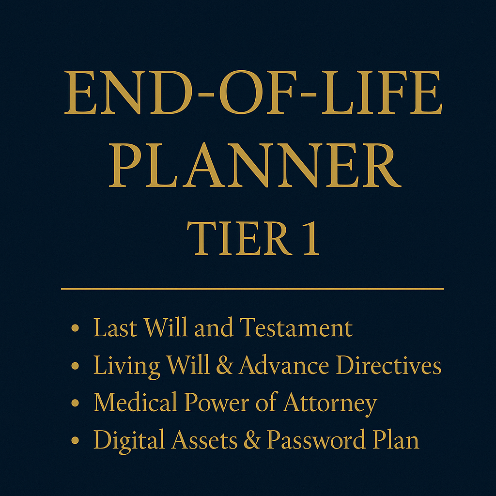 The End-of-Life Planner Starter Pack gives you the absolute essentials for peace of mind. Instantly generate your Last Will & Testament, Living Will & Advance Directives, Medical Power of Attorney, Digital Assets & Password Plan, and Funeral & Memorial Wishes — all in one simple, printable packet. Quick, clear, and designed to remove uncertainty for your loved ones.