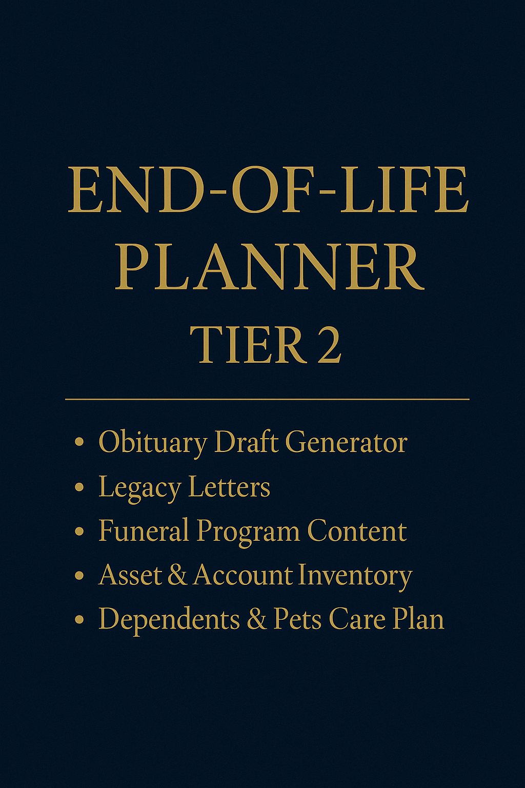 Take your planning beyond the basics. The Pro Legacy Pack adds the emotional and logistical layers that truly ease the burden on your family. Generate a personalized Obituary Draft, heartfelt Legacy Letters, Funeral Program Content, an Asset & Account Inventory, and Dependents & Pets Care Plan.
