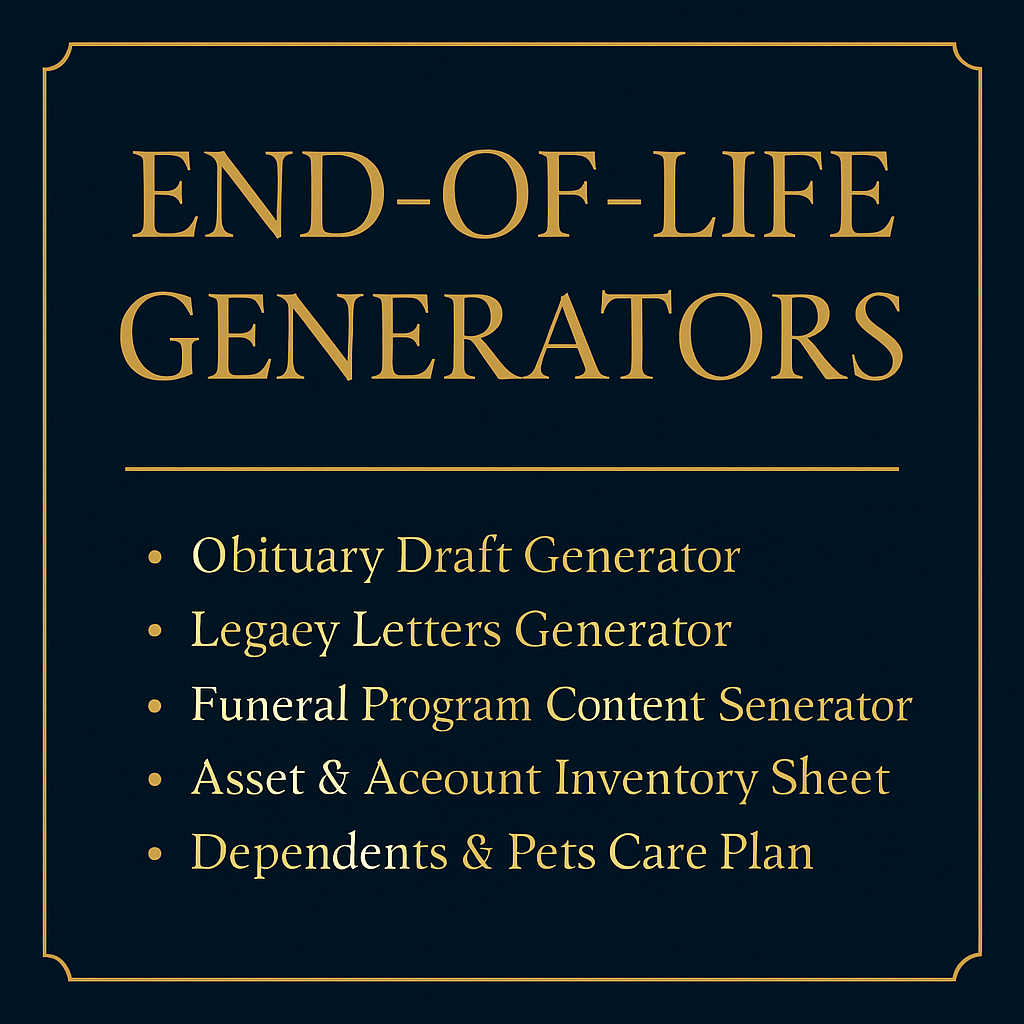 💡 That’s why we built the End-of-Life Generators — done-for-you digital tools that instantly create everything your loved ones will need: from wills and directives, to legacy letters, to complete executor checklists.