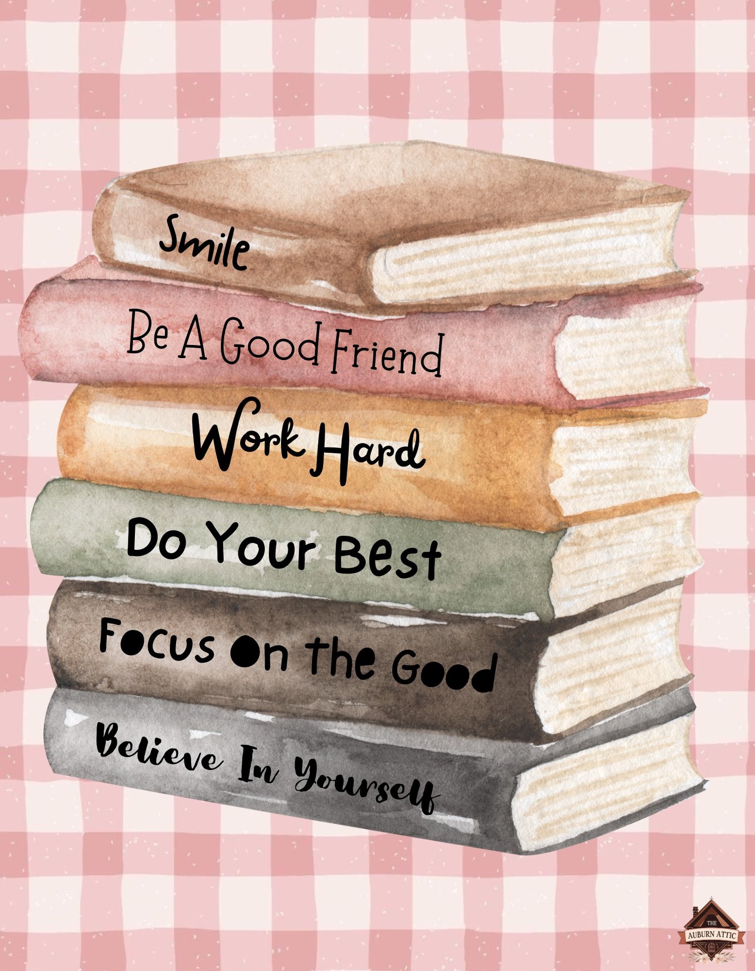 Brighten up your classroom or library with this charming printable PNG! Featuring a stack of soft pastel-colored books, each spine adorned with uplifting, encouraging phrases, this design brings positivity and warmth to any space. The gentle blush plaid background adds a cozy, inviting touch—perfect for inspiring young readers and educators alike. Ideal for bulletin boards, reading corners, or as a thoughtful gift for teachers and book lovers, this high-quality PNG is ready to print and display wherever motivation and a love of reading are needed most.