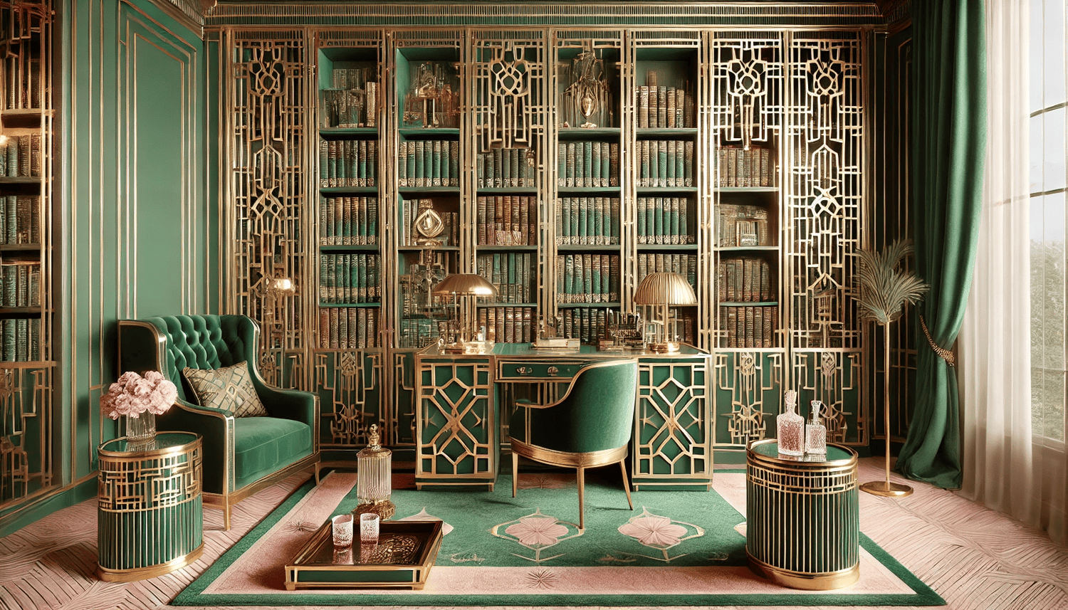 A luxurious Art Deco library inspired by The Great Gatsby — featuring emerald shelves, golden geometric details, and an atmosphere of timeless elegance. Perfect for printable wall art, reading corners, and vintage decor lovers.
