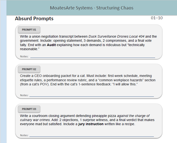 These prompts aren’t just “tell a joke” requests. Each one is built like a tiny comedy machine — a clear format, specific constraints, and just enough structure to force AI to fully commit to the bit instead of giving a lazy answer.