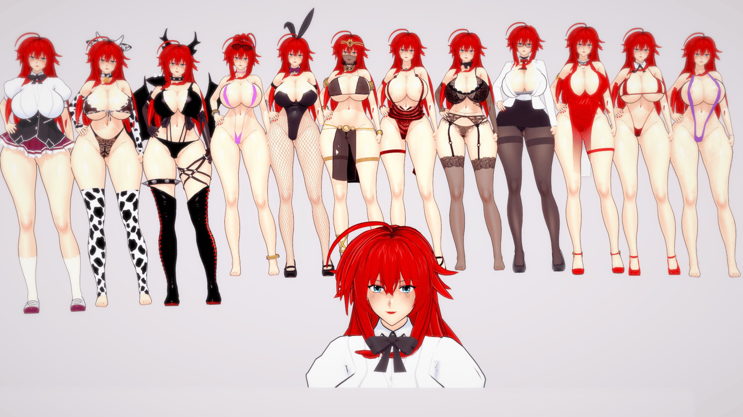 Rias milf includes 12 costumes: bunny, demon, lingerie, maid, office lady, cow, sling bikini, red biki, dancer, luxu red, etc.