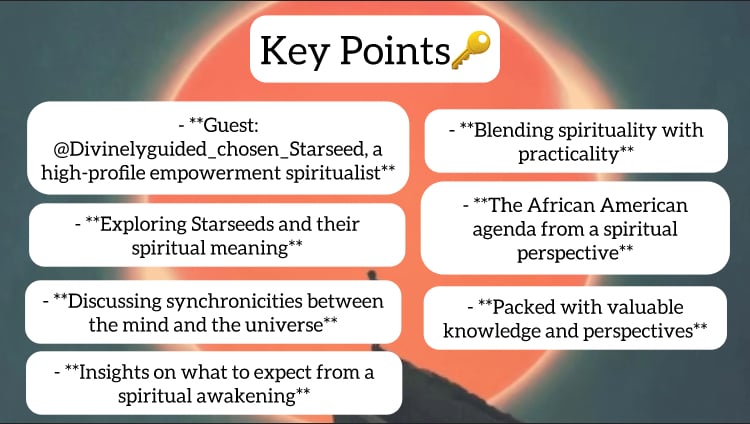 In this episode, we are honored to be joined by @Divinelyguided_chosen_Starseed, a high-profile empowerment spiritualist from the spiritual community. Together, we dive deep into the mystical world of Starseeds, exploring their spiritual meaning and significance.