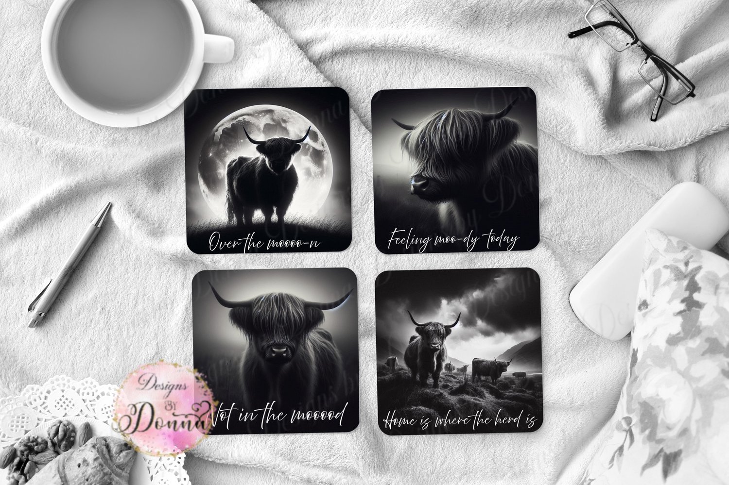 A stunning set of 4 atmospheric b&w highland cow mug and coaster designs