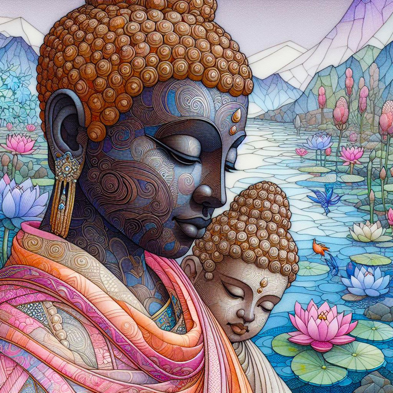 Dark skin buddha with swirly patterned skin. wears delicate pink & orange woven robes with silver stitching detail & gold headpiece. looks down to a small child buddha with swirly patterned skin, with blue & cream robes. They are beside a lake with blue & pink lotus flowers, mountains, pink & blue trees, humming birds, purple sky. Mosaic pastel effect.
