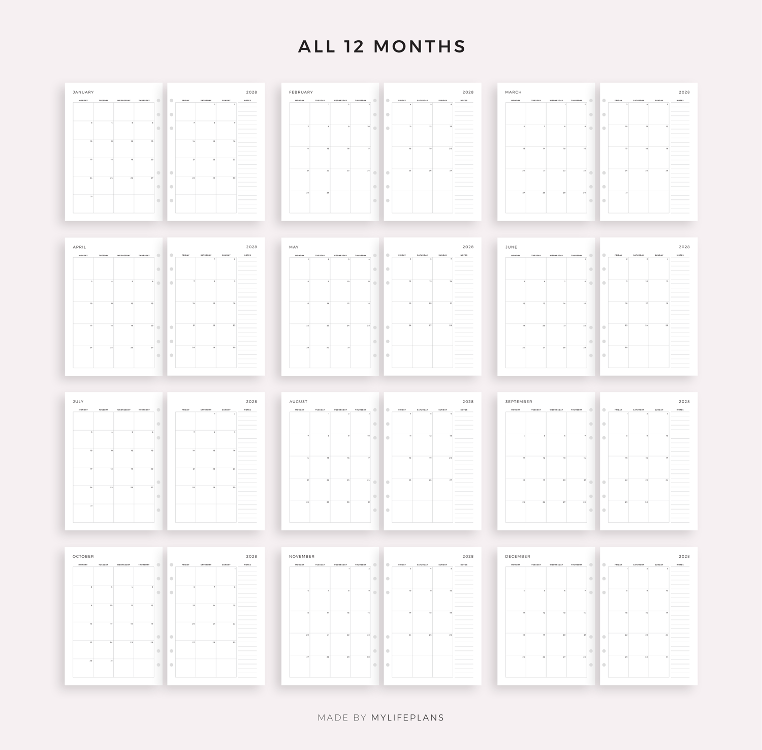 2028 Monthly Calendar on Two Pages with Notes, Printable & Fillable, A4/Letter Size