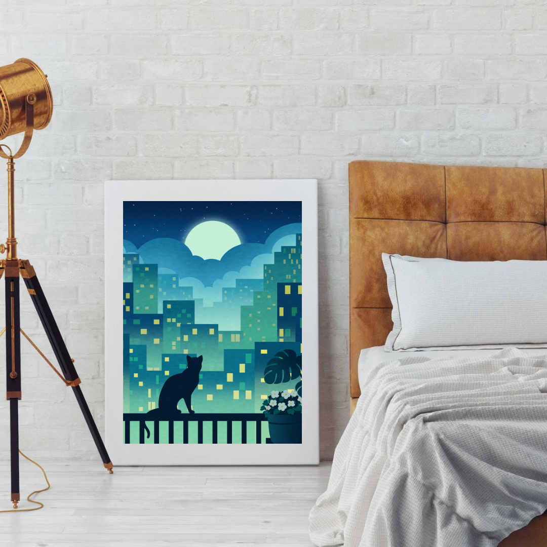 Cat In The Big City captures a quiet, thoughtful moment in the middle of a bustling urban night. A black cat sits calmly on a balcony railing, gazing out at the glowing windows and towering buildings, as if trying to understand the rhythm of the city. It’s a scene of stillness amid movement, where the cat becomes a silent observer of human life from its little corner of the world. This artwork reflects the feeling of being small in a big place, yet still finding peace in the view.