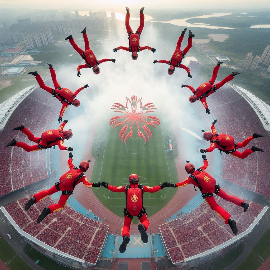一年一度的國慶高空跳傘是整個國慶群眾大會即將開始的重頭戲!跳傘成員它们從空中降落象徵着一組來自國家不同領域的成員掌握各自的能力和技巧團結眾人的力量以共同的目標和使命在這片安祥的大地為人民創造安居樂業的國家!