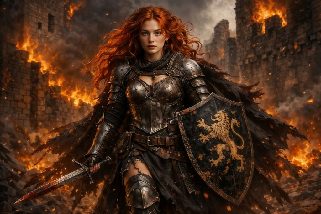 Emberborn Lionheart captures a fierce red-haired knight striding through a collapsing fortress—steel scarred, cloak torn, blade stained, and a lion-crested shield held high as firestorms rage behind her.