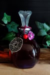 Pullossa on tummanpunaista nestettä ja se on koristeltu käsintehdyllä etiketillä, nauhoilla ja pitsillä. Pullo on myös koristeltu kukilla ja punaisilla karviaismarjoilla