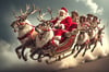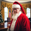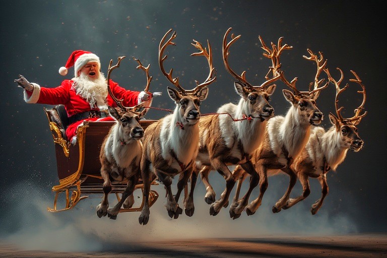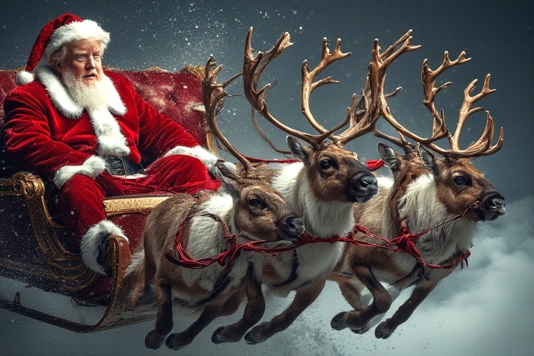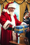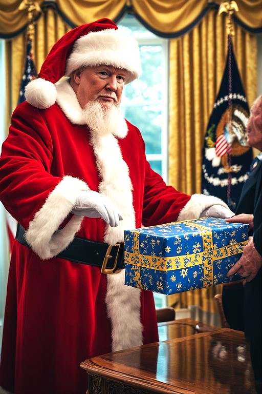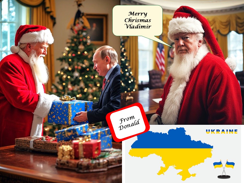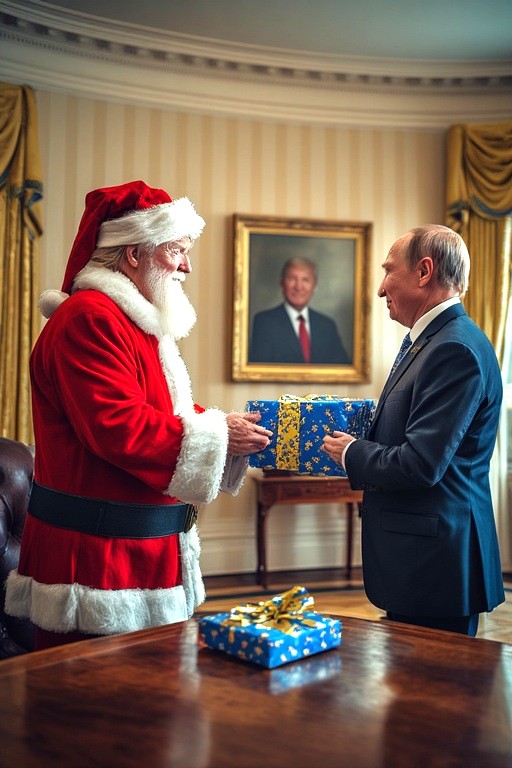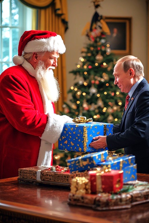 Cartoon Donald Trump deliver Christmas gifts to Vladimir Putin.