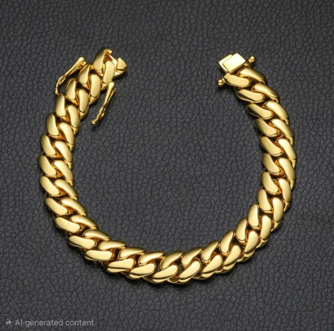 This Cuban link chain bracelet is crafted from high-quality brass and plated with 14K or 18K gold using a five-layer plating process for enhanced resistance to tarnishing and long-lasting brilliance. The substantial, heavyweight feel and versatile design make it suitable for any occasion, from everyday wear to formal events.