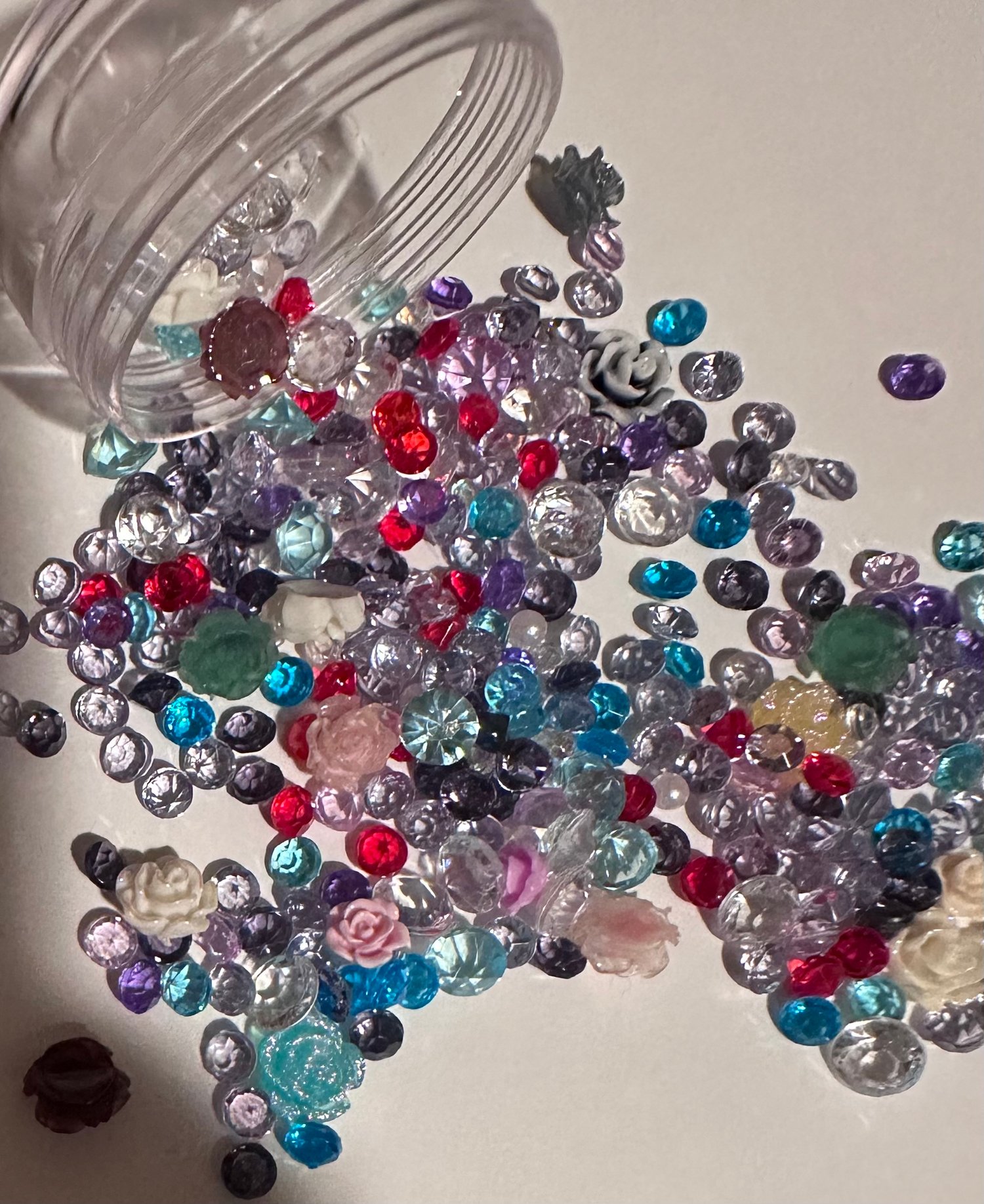 In this listing, you will receive a half an ounce of acrylic confetti. The flowers have flat backs and the stones are shaped like a diamonds. The photos in this listing is 0.6 oz and comes with the container shown.