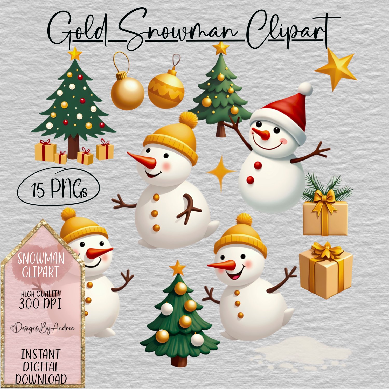Festive Snowman Christmas clipart. White and gold, Perfect for sublimation, cards, mugs, and holiday crafts. Instant digital download, 15 high-quality 300 DPI transparent files