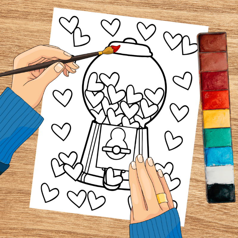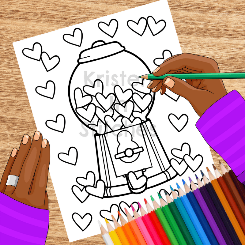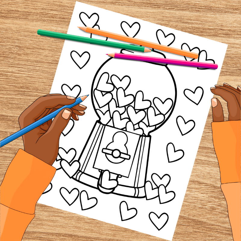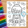 Valentine Gumball Machine Coloring Page, Printable 8.5x11 Paper, PDF & PNG File, Bubblegum Hearts