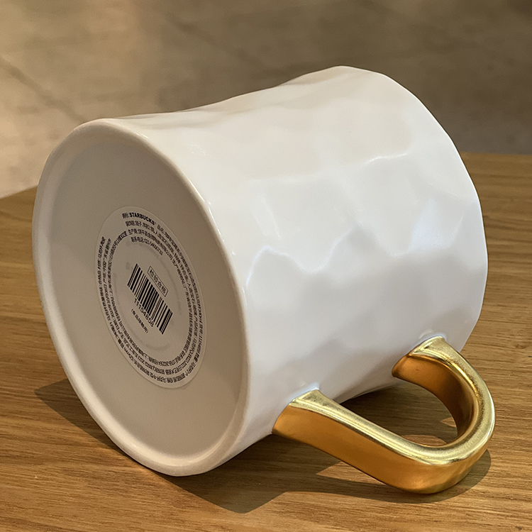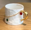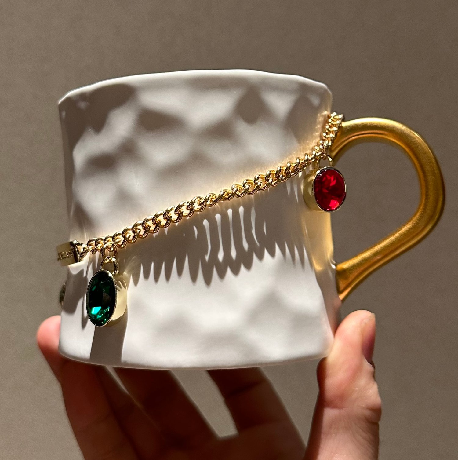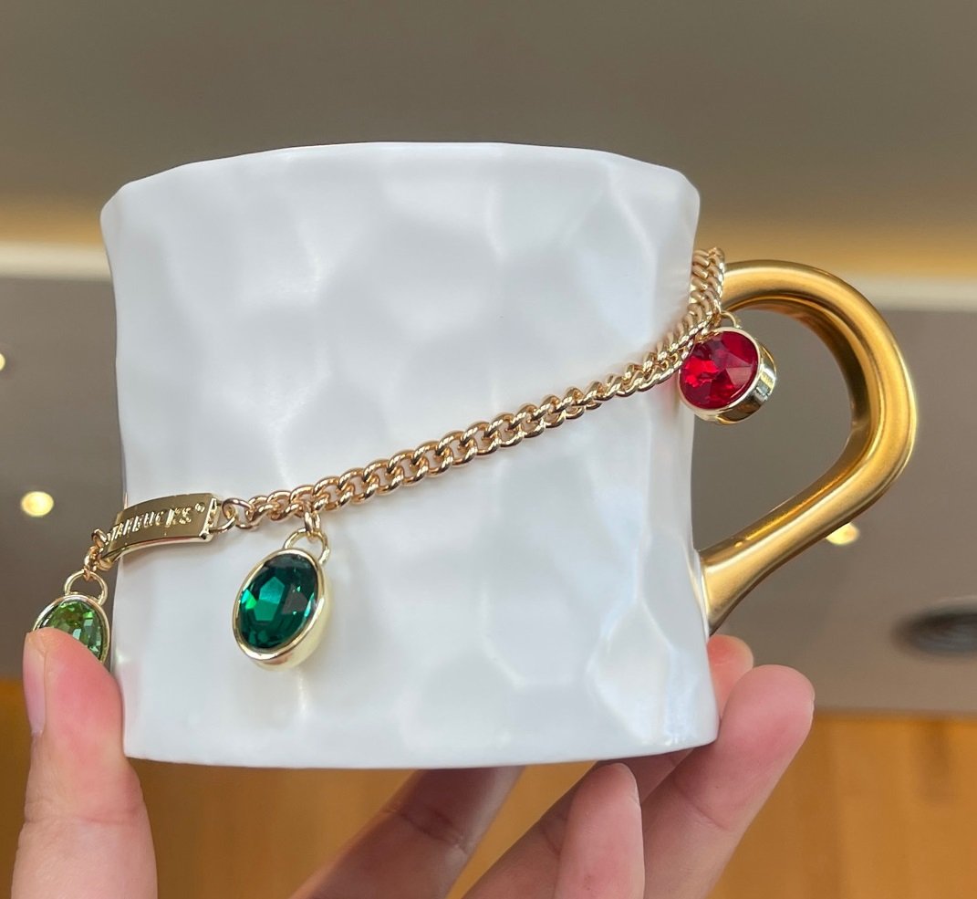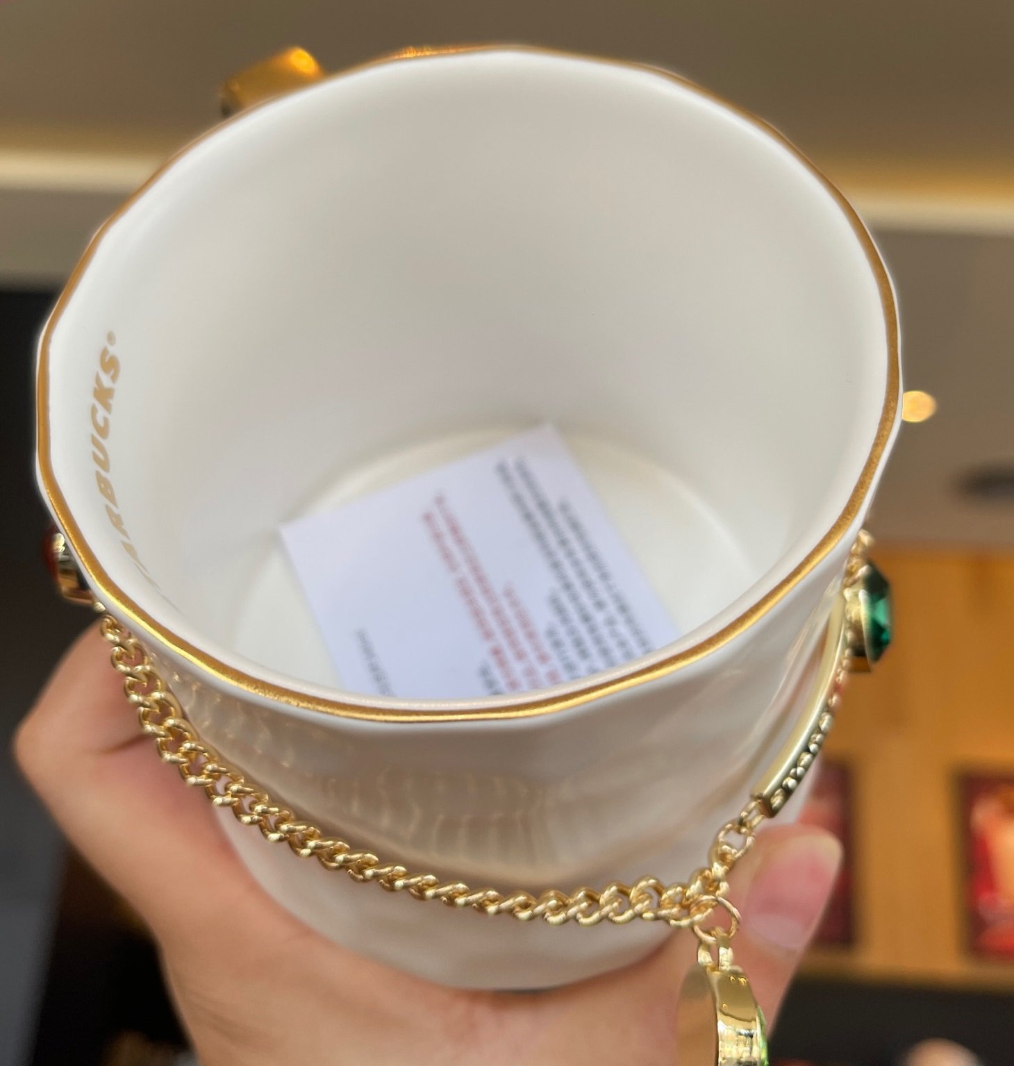 2023 Starbucks China Classic Coffee Series White/Gold Dimpled Porcelain Mug with Golden Chain beset with Red & Green Gemstones